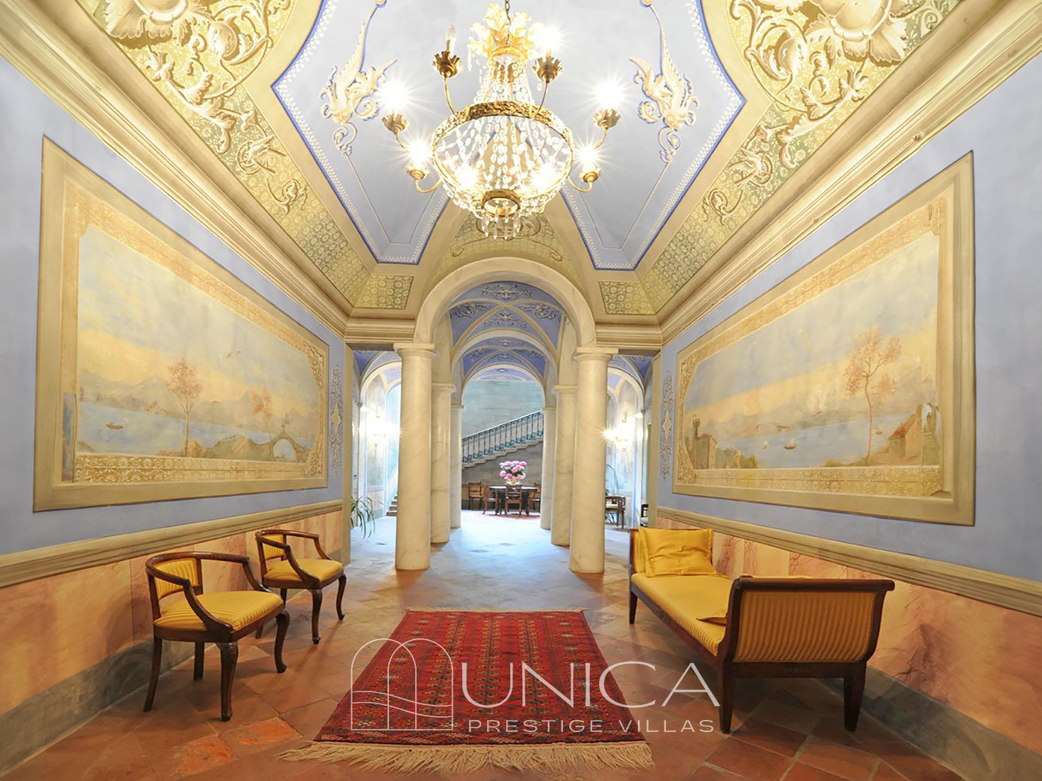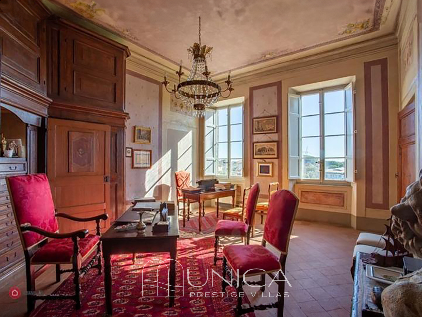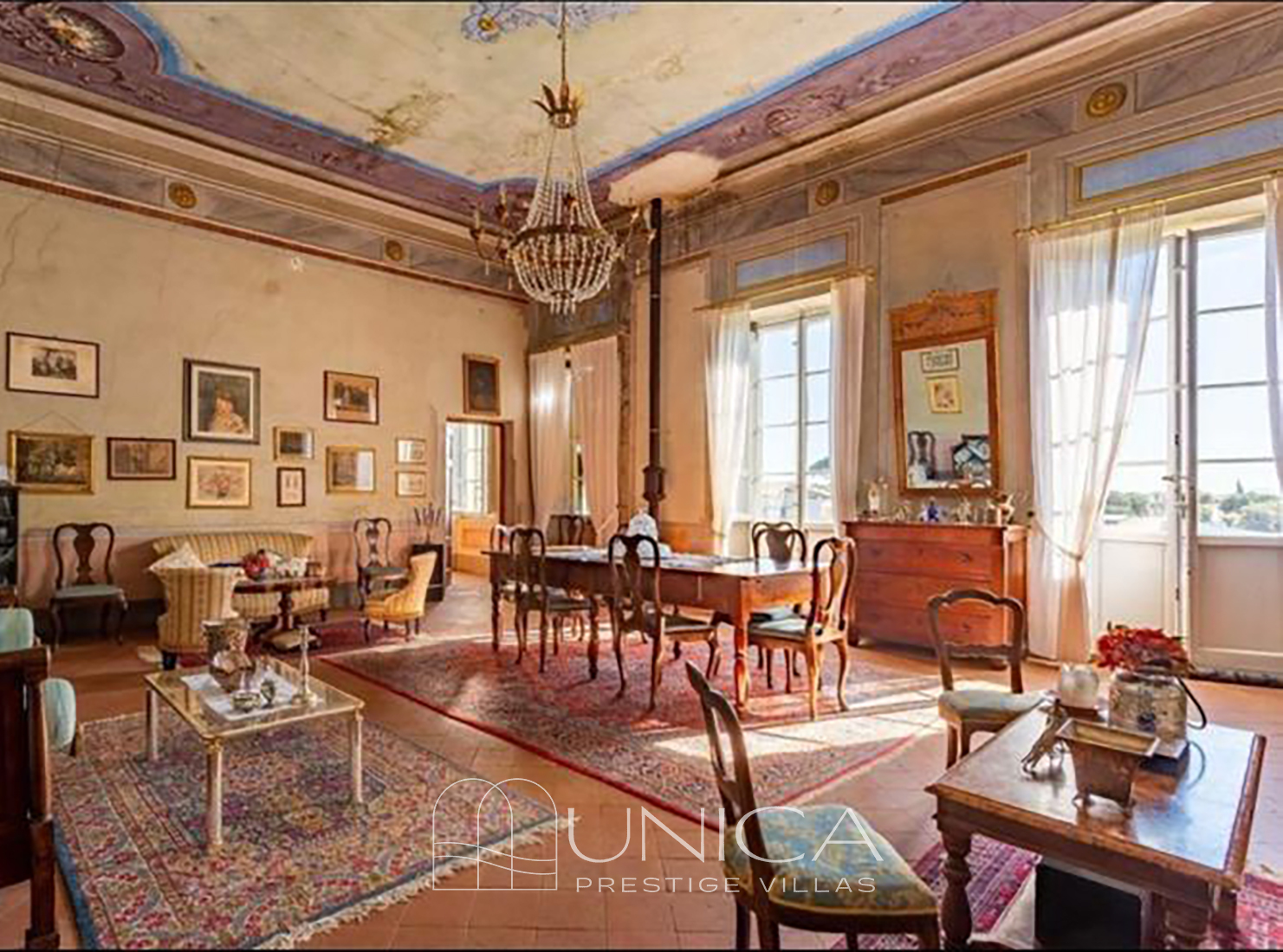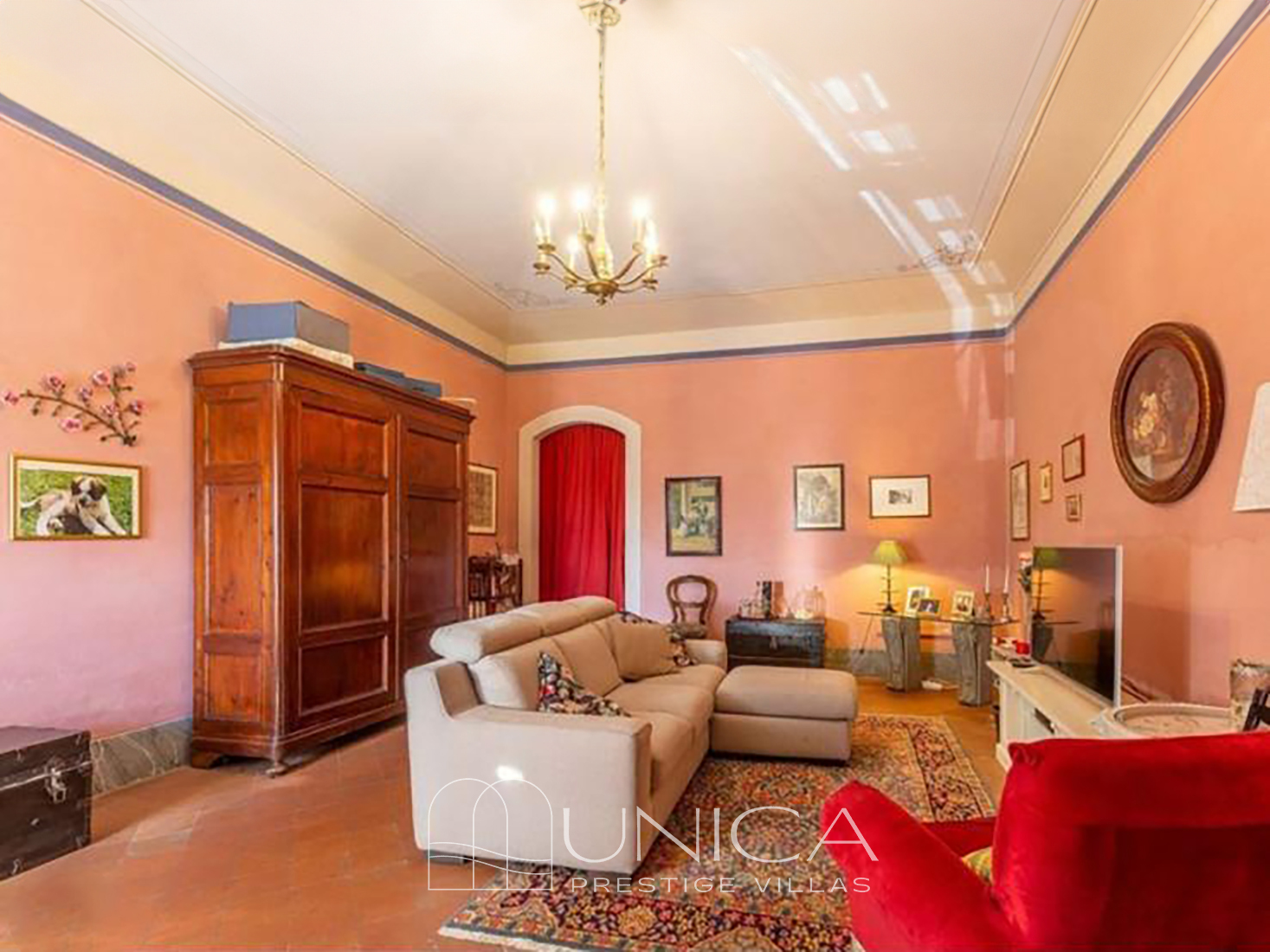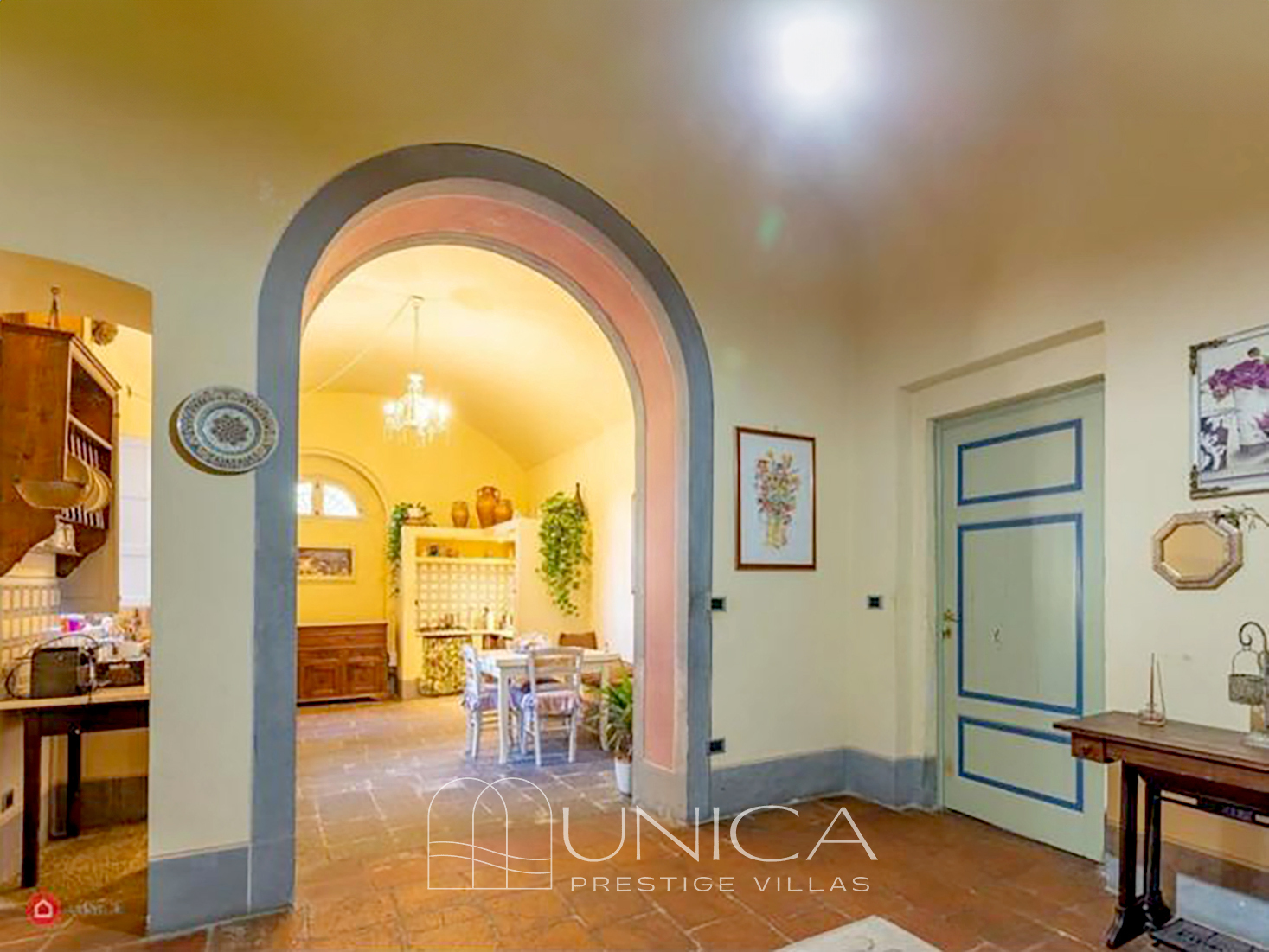 The interiors retain the authentic charm of noble Lucchese residences: antique terracotta floors, stone fireplaces, frescoes, restored original window and door frames, and an architectural “enfilade” of rooms that creates visual depth and a graceful narrative flow from one space to the next.