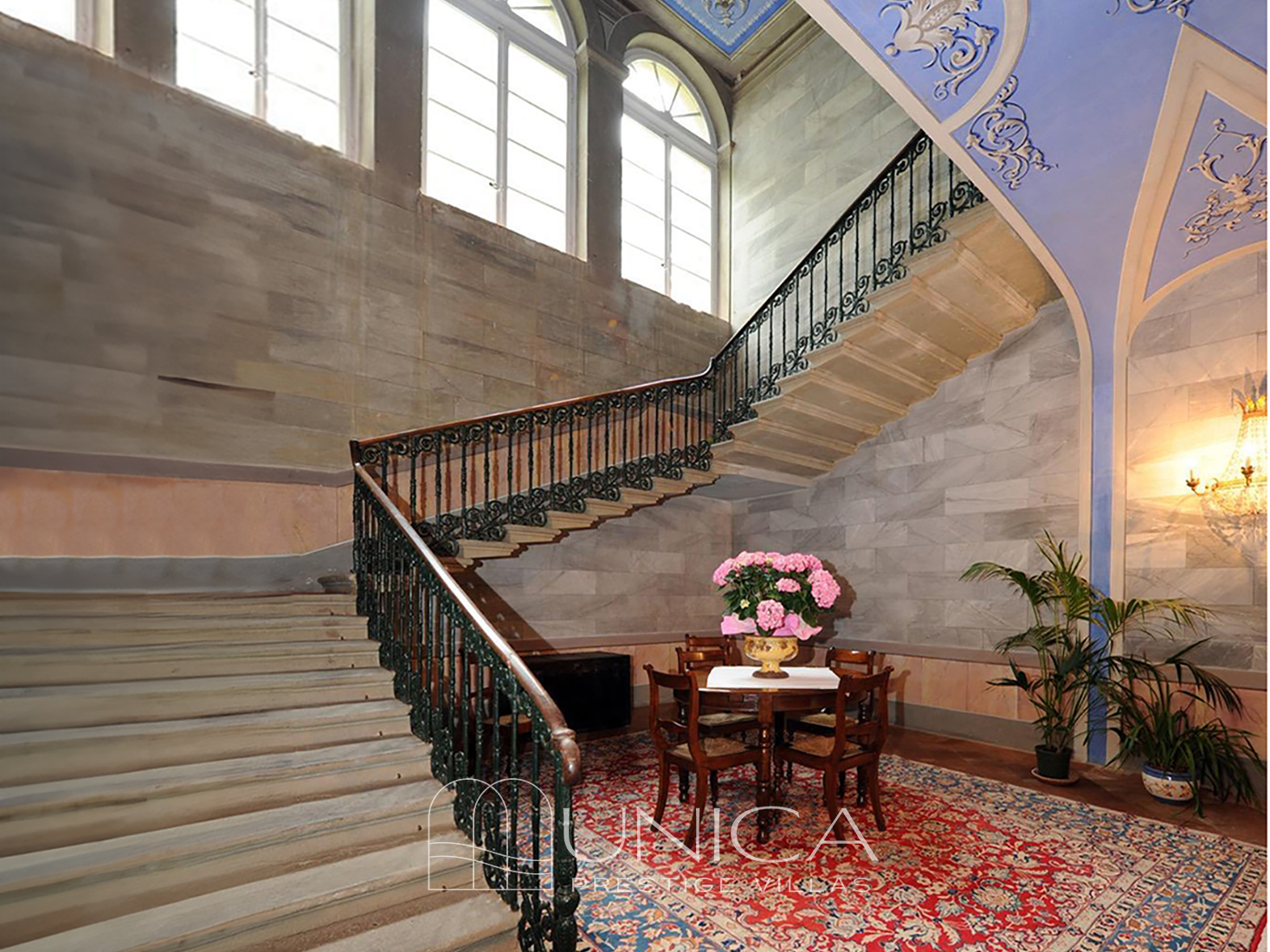 A grand staircase in Matraia stone, adorned with a wrought-iron balustrade, leads to the piano nobile, currently arranged as a single, stately residence. This level forms the heart of the villa: a main frescoed salon, two elegant living rooms, a study, kitchen, four master bedrooms, and three bathrooms. Three panoramic terraces overlook the garden and the surrounding countryside, bringing light and a sense of depth to the interiors.