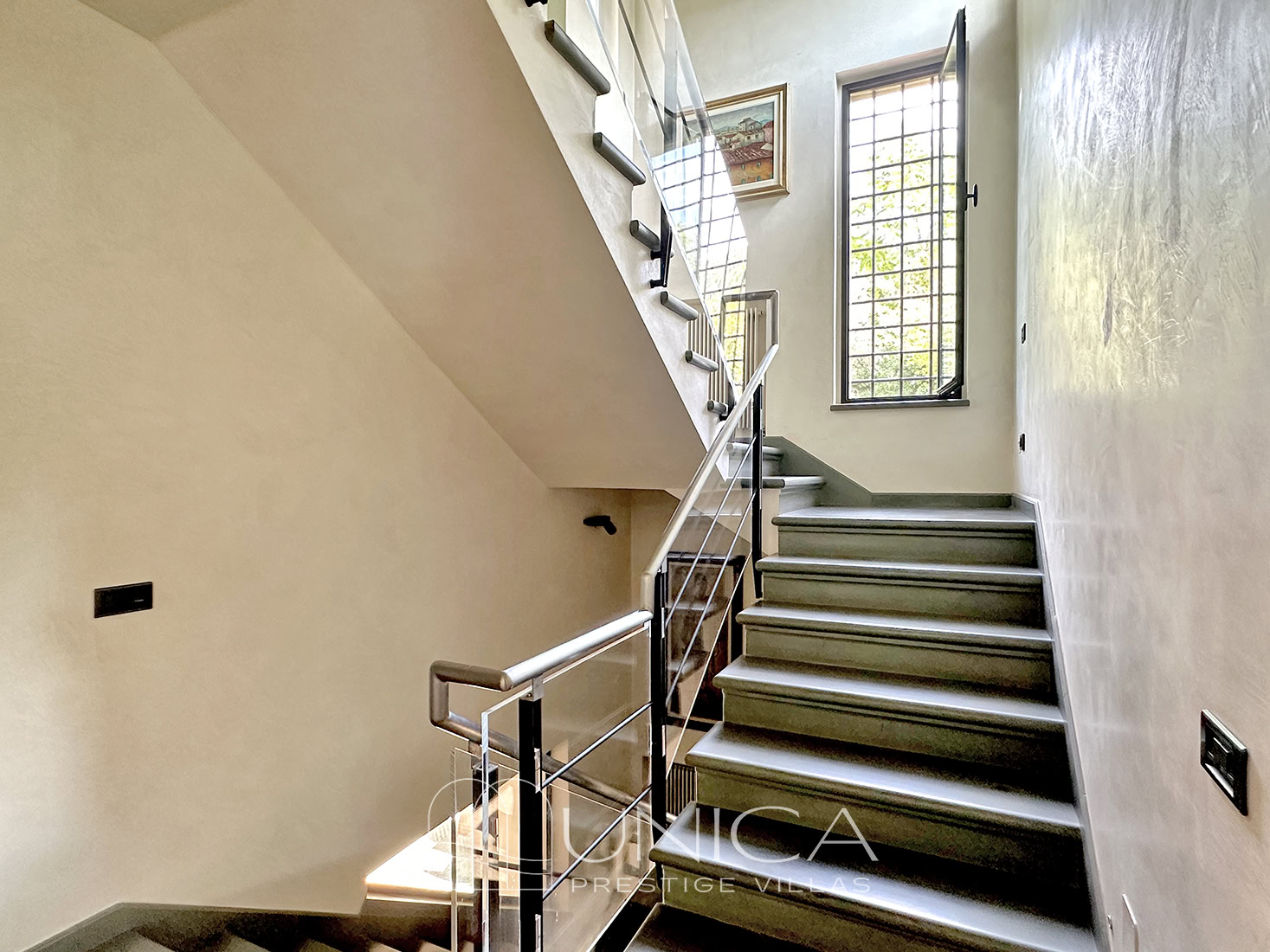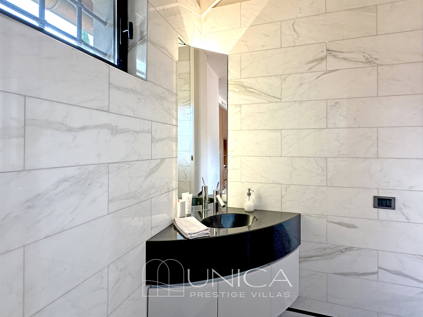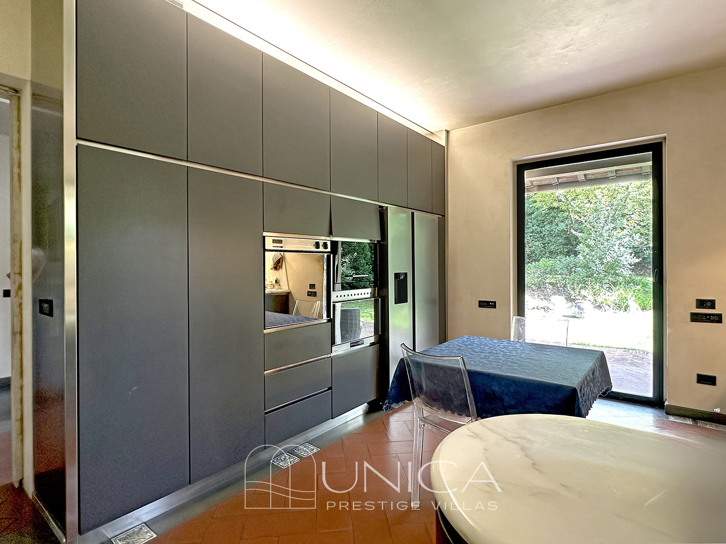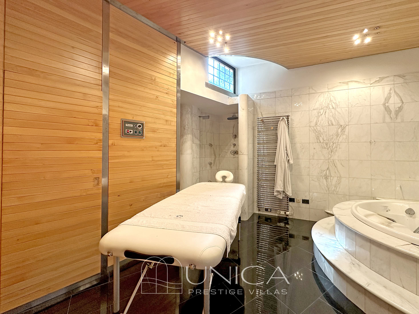 The villa is distributed over three levels, all connected by an internal elevator. On the ground floor, a spacious split-level living area opens into the formal dining room, both flooded with natural light from large windows overlooking the garden and patio. The kitchen is directly connected to the dining area and has access to a cozy outdoor space. This level also hosts two double bedrooms, each with en-suite bathrooms, as well as a private study. The first floor is dedicated to the master suite, which includes two elegant bathrooms and a panoramic multipurpose room currently used as a gym, framed by stunning picture windows. The lower level, which is fully above ground and directly connected to the garden, features a second living area with a dining space and a fully equipped kitchen, a double bedroom with en-suite bathroom, and a wellness area complete with sauna and hydromassage tub. This floor also includes a laundry room and several utility spaces. The finishes are of the highest quality: terracotta floors, exposed wooden beams, solid wood fixtures, and finely crafted architectural details. The overall atmosphere is both elegant and inviting, making this villa an ideal choice for luxurious everyday living or entertaining guests in style.