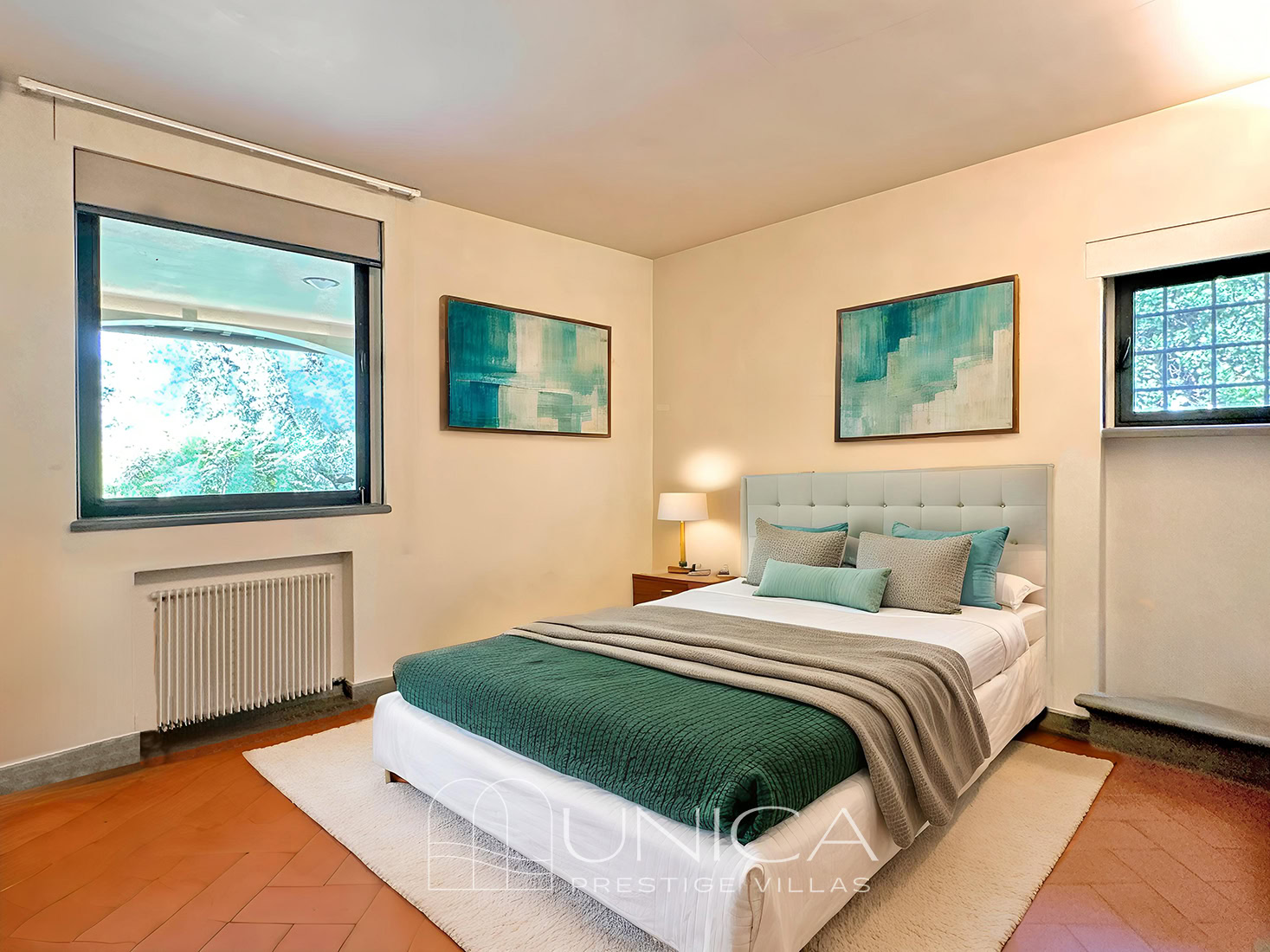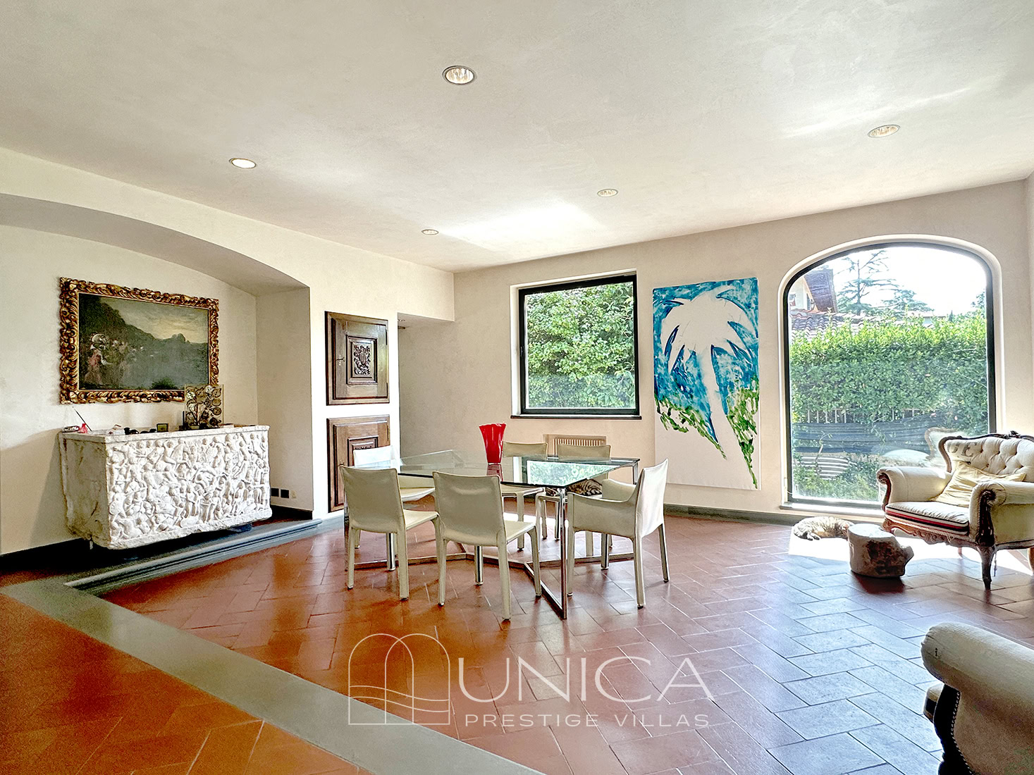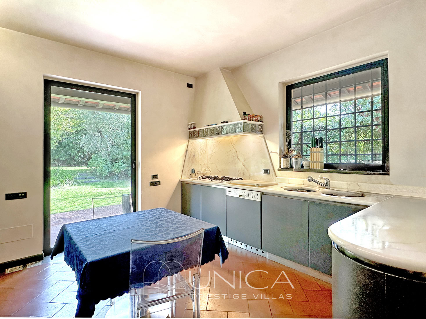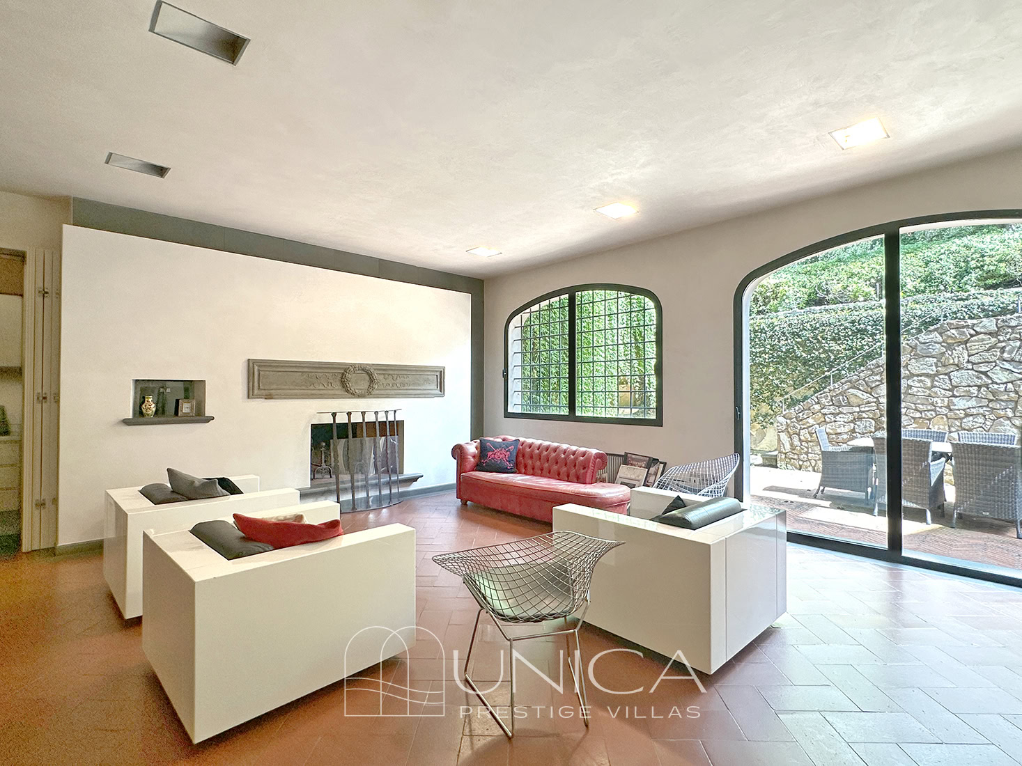 The villa is distributed over three levels, all connected by an internal elevator. On the ground floor, a spacious split-level living area opens into the formal dining room, both flooded with natural light from large windows overlooking the garden and patio. The kitchen is directly connected to the dining area and has access to a cozy outdoor space. This level also hosts two double bedrooms, each with en-suite bathrooms, as well as a private study. The first floor is dedicated to the master suite, which includes two elegant bathrooms and a panoramic multipurpose room currently used as a gym, framed by stunning picture windows. The lower level, which is fully above ground and directly connected to the garden, features a second living area with a dining space and a fully equipped kitchen, a double bedroom with en-suite bathroom, and a wellness area complete with sauna and hydromassage tub. This floor also includes a laundry room and several utility spaces. The finishes are of the highest quality: terracotta floors, exposed wooden beams, solid wood fixtures, and finely crafted architectural details. The overall atmosphere is both elegant and inviting, making this villa an ideal choice for luxurious everyday living or entertaining guests in style.