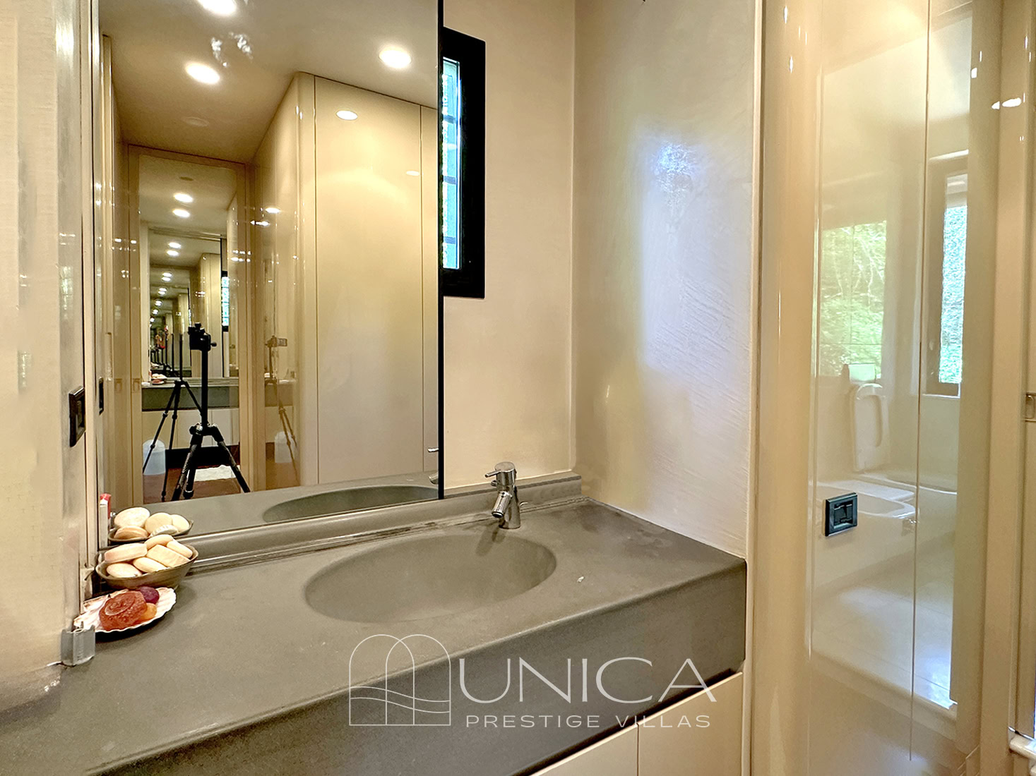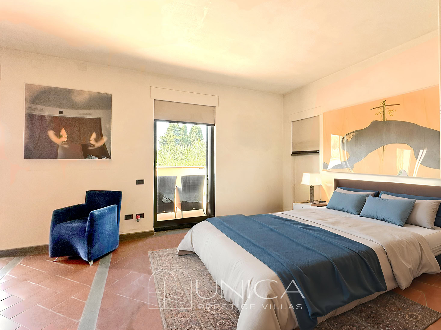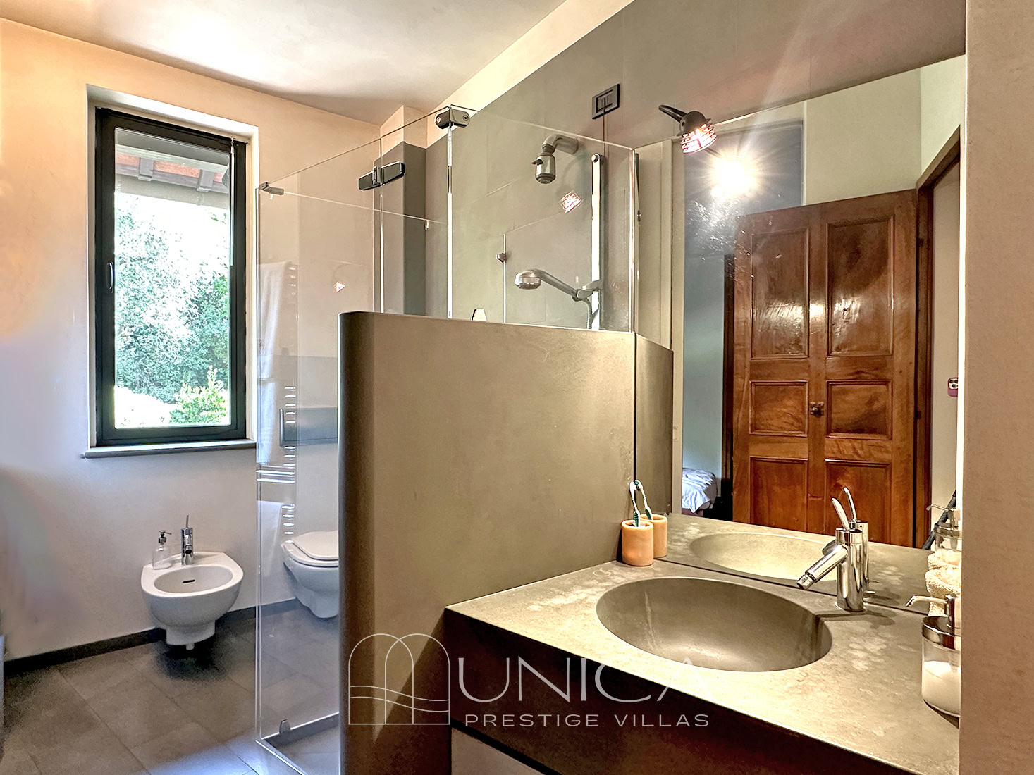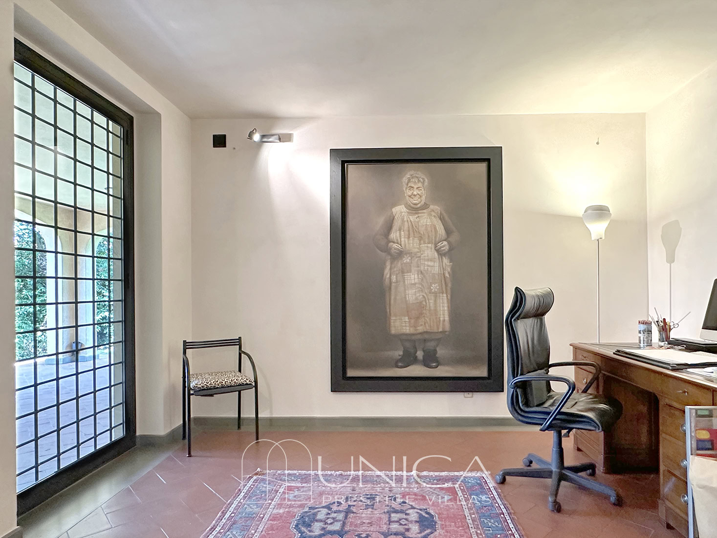 The villa is distributed over three levels, all connected by an internal elevator. On the ground floor, a spacious split-level living area opens into the formal dining room, both flooded with natural light from large windows overlooking the garden and patio. The kitchen is directly connected to the dining area and has access to a cozy outdoor space. This level also hosts two double bedrooms, each with en-suite bathrooms, as well as a private study. The first floor is dedicated to the master suite, which includes two elegant bathrooms and a panoramic multipurpose room currently used as a gym, framed by stunning picture windows. The lower level, which is fully above ground and directly connected to the garden, features a second living area with a dining space and a fully equipped kitchen, a double bedroom with en-suite bathroom, and a wellness area complete with sauna and hydromassage tub. This floor also includes a laundry room and several utility spaces. The finishes are of the highest quality: terracotta floors, exposed wooden beams, solid wood fixtures, and finely crafted architectural details. The overall atmosphere is both elegant and inviting, making this villa an ideal choice for luxurious everyday living or entertaining guests in style.