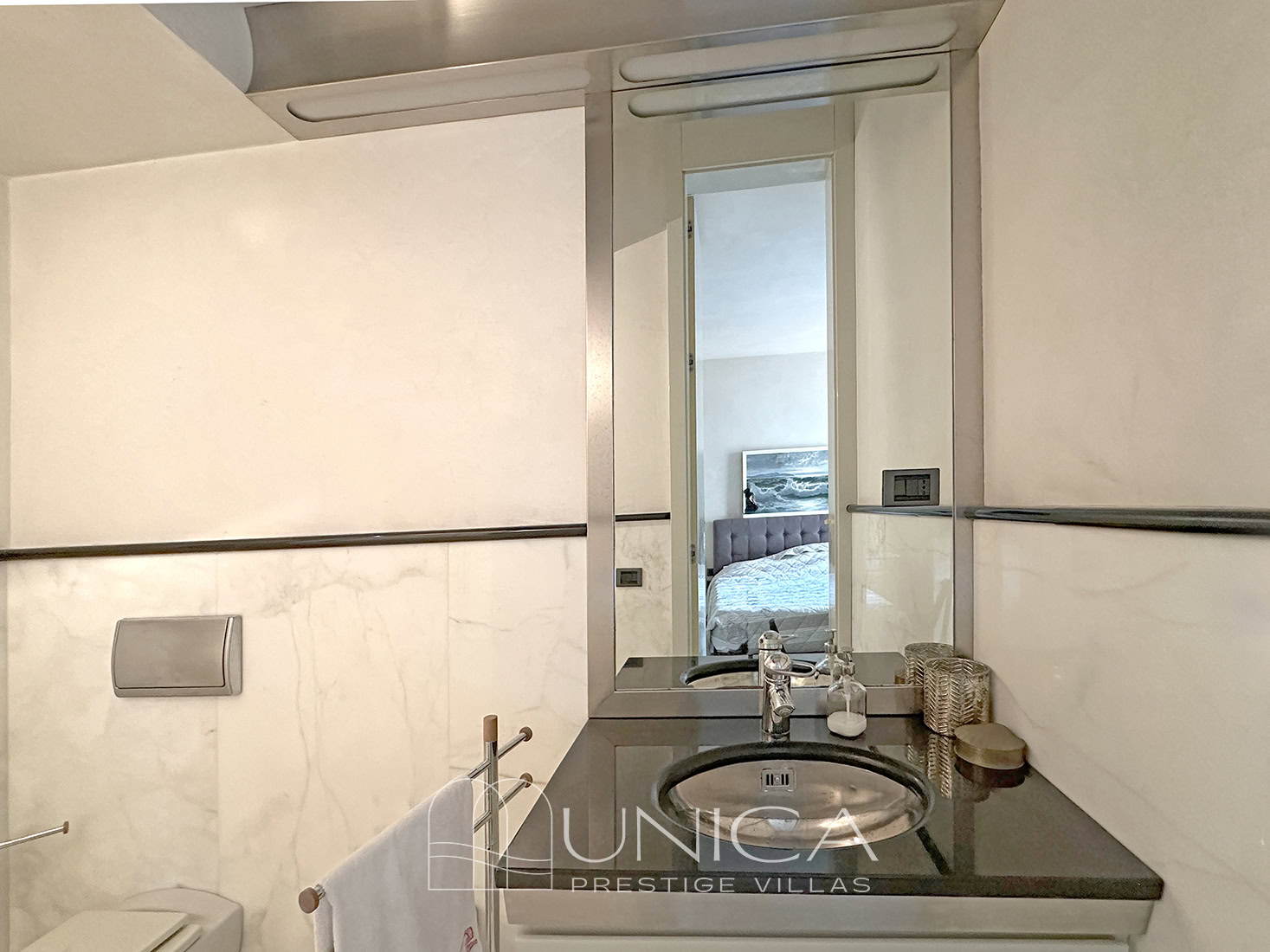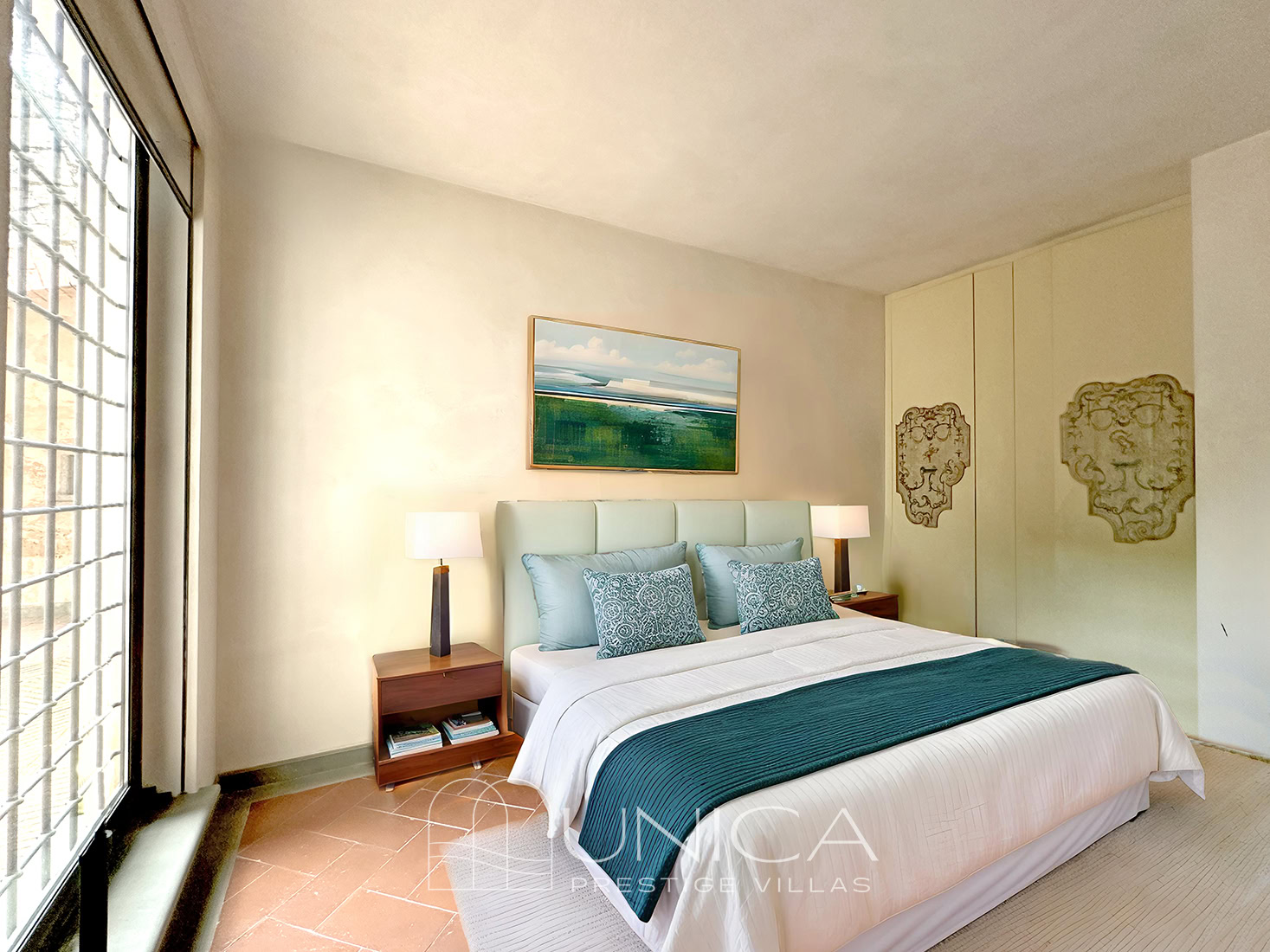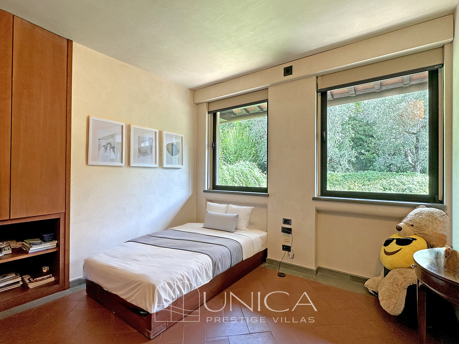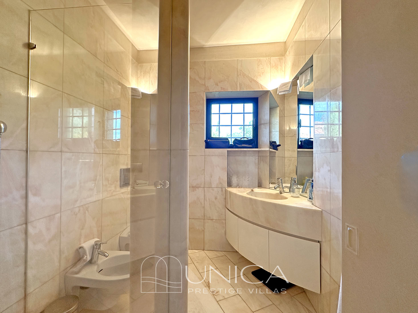 The villa is distributed over three levels, all connected by an internal elevator. On the ground floor, a spacious split-level living area opens into the formal dining room, both flooded with natural light from large windows overlooking the garden and patio. The kitchen is directly connected to the dining area and has access to a cozy outdoor space. This level also hosts two double bedrooms, each with en-suite bathrooms, as well as a private study. The first floor is dedicated to the master suite, which includes two elegant bathrooms and a panoramic multipurpose room currently used as a gym, framed by stunning picture windows. The lower level, which is fully above ground and directly connected to the garden, features a second living area with a dining space and a fully equipped kitchen, a double bedroom with en-suite bathroom, and a wellness area complete with sauna and hydromassage tub. This floor also includes a laundry room and several utility spaces. The finishes are of the highest quality: terracotta floors, exposed wooden beams, solid wood fixtures, and finely crafted architectural details. The overall atmosphere is both elegant and inviting, making this villa an ideal choice for luxurious everyday living or entertaining guests in style.