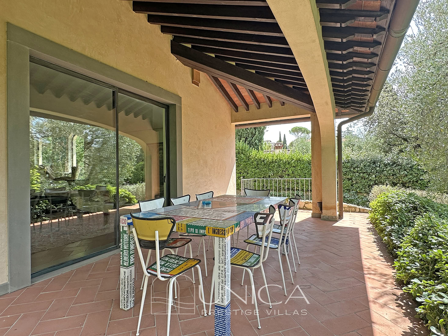 The villa is surrounded by approximately 700 sqm of lush garden, carefully landscaped with olive trees, flowering bushes, and stone-paved walkways. The property has two entrances: a pedestrian path that elegantly leads to the main living area and a driveway that accesses the spacious 50 sqm garage located on the lower level. The façade features a charming covered patio on the ground floor, ideal for al fresco dining and furnished with a large table overlooking the garden. Adjacent to the kitchen, another outdoor area is set up for informal meals or morning breakfasts. At the rear of the property, a private courtyard offers yet another delightful dining space with a wicker table and chairs, enhanced by a traditional wood-fired oven—perfect for baking pizza or bread. The atmosphere is tranquil and private, with abundant vegetation providing natural shade and seclusion. Thanks to the numerous openings and large windows, the house is perfectly integrated with its surroundings, offering charming views from every angle. These outdoor spaces are designed to be enjoyed year-round and function as natural extensions of the indoor living areas.