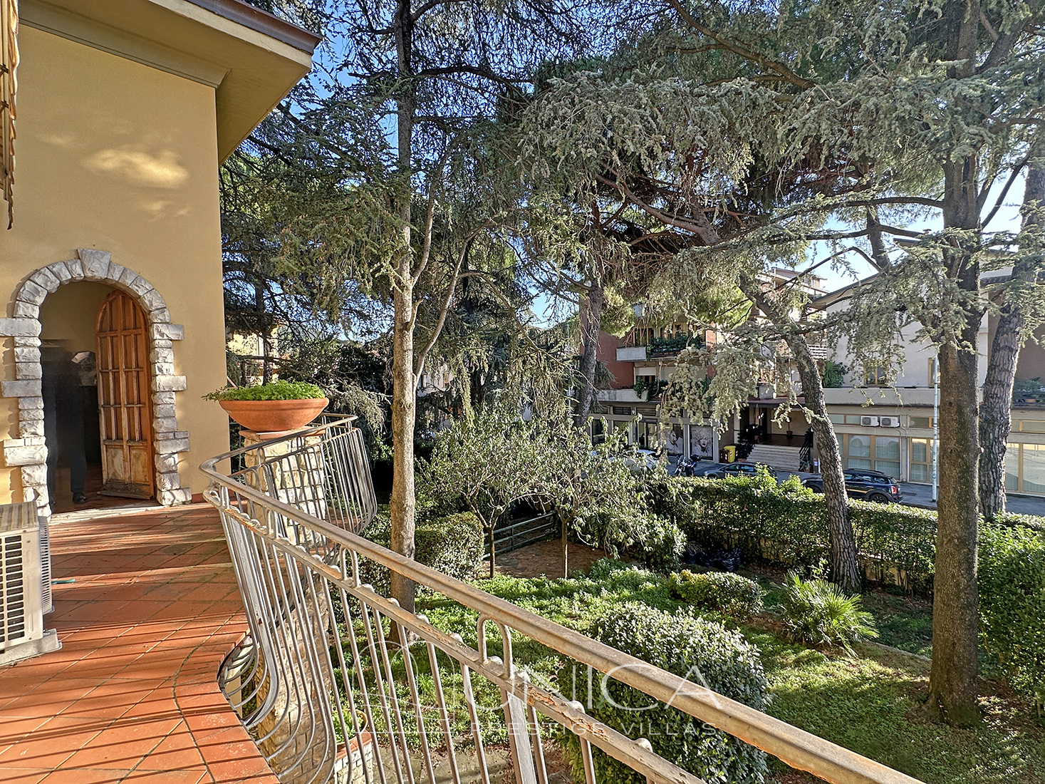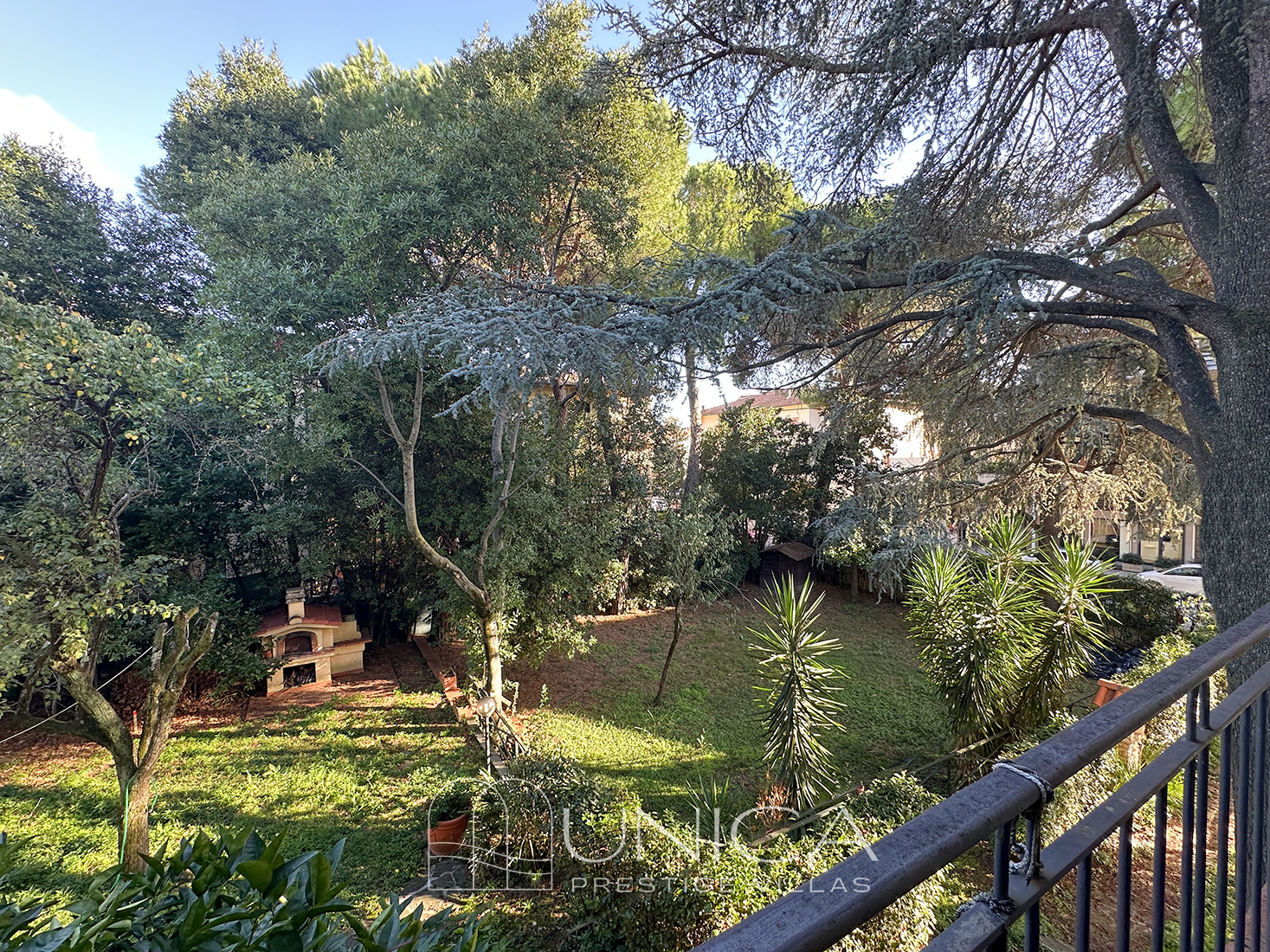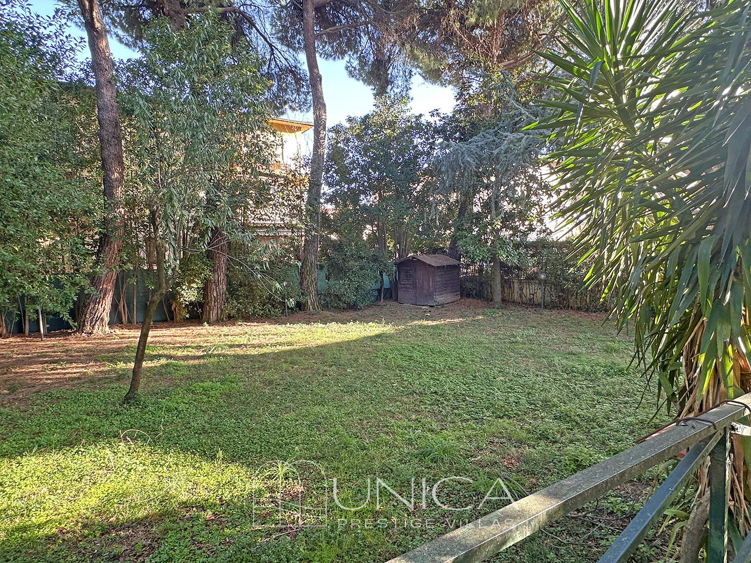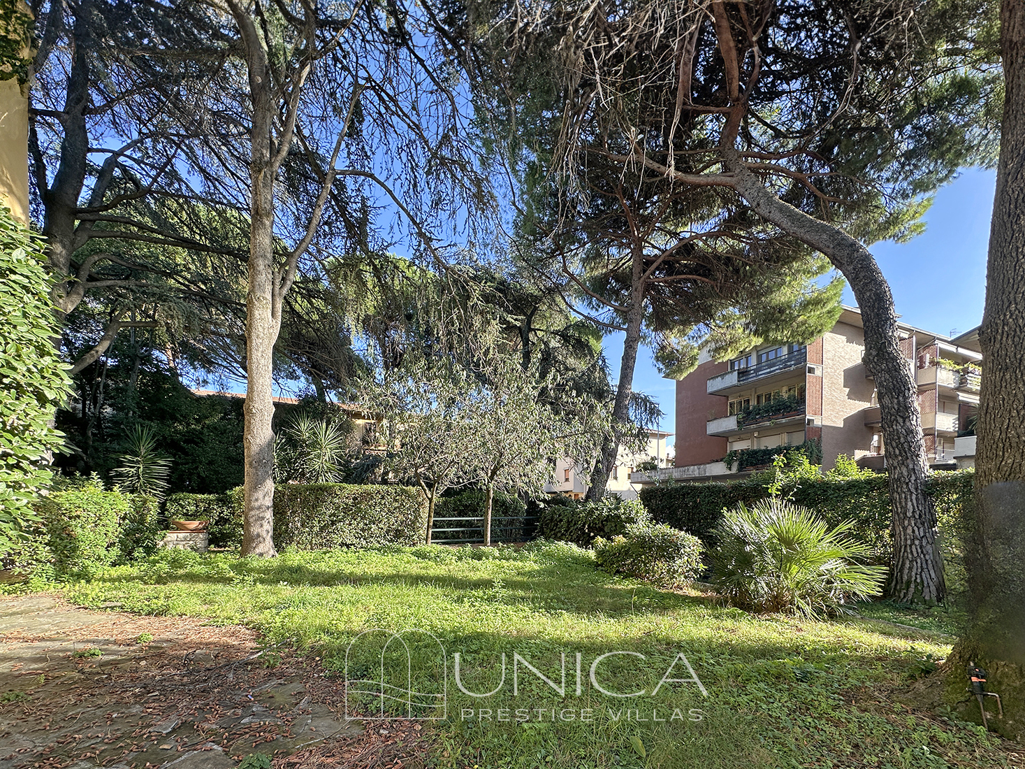 Free on three sides and wrapped in a garden of about 1,000 sqm, the property offers privacy and generous outdoor space. Perimeter planting and tall, established trees create both sunlit corners and cool shade—perfect for open-air living areas, a play zone and secluded spots to unwind. The façades are animated by balconies and a corner terrace; the main entrance on the front serves the ground-floor apartment, while a second, lateral entrance serves the first-floor unit via a dedicated internal staircase.