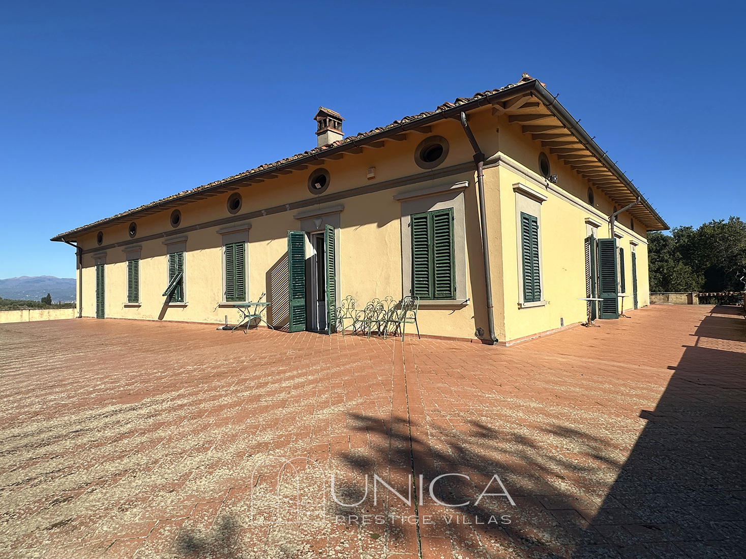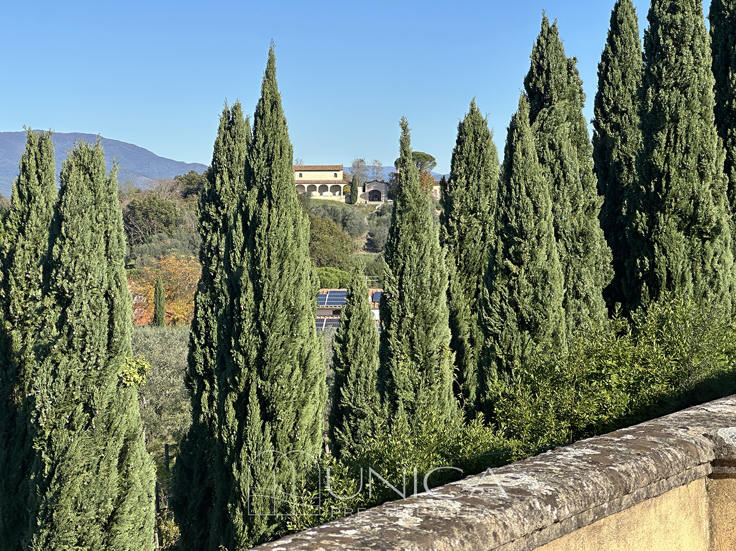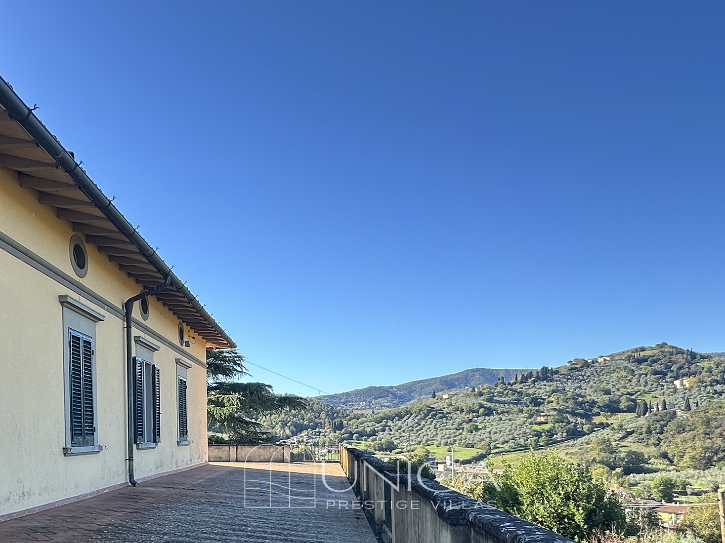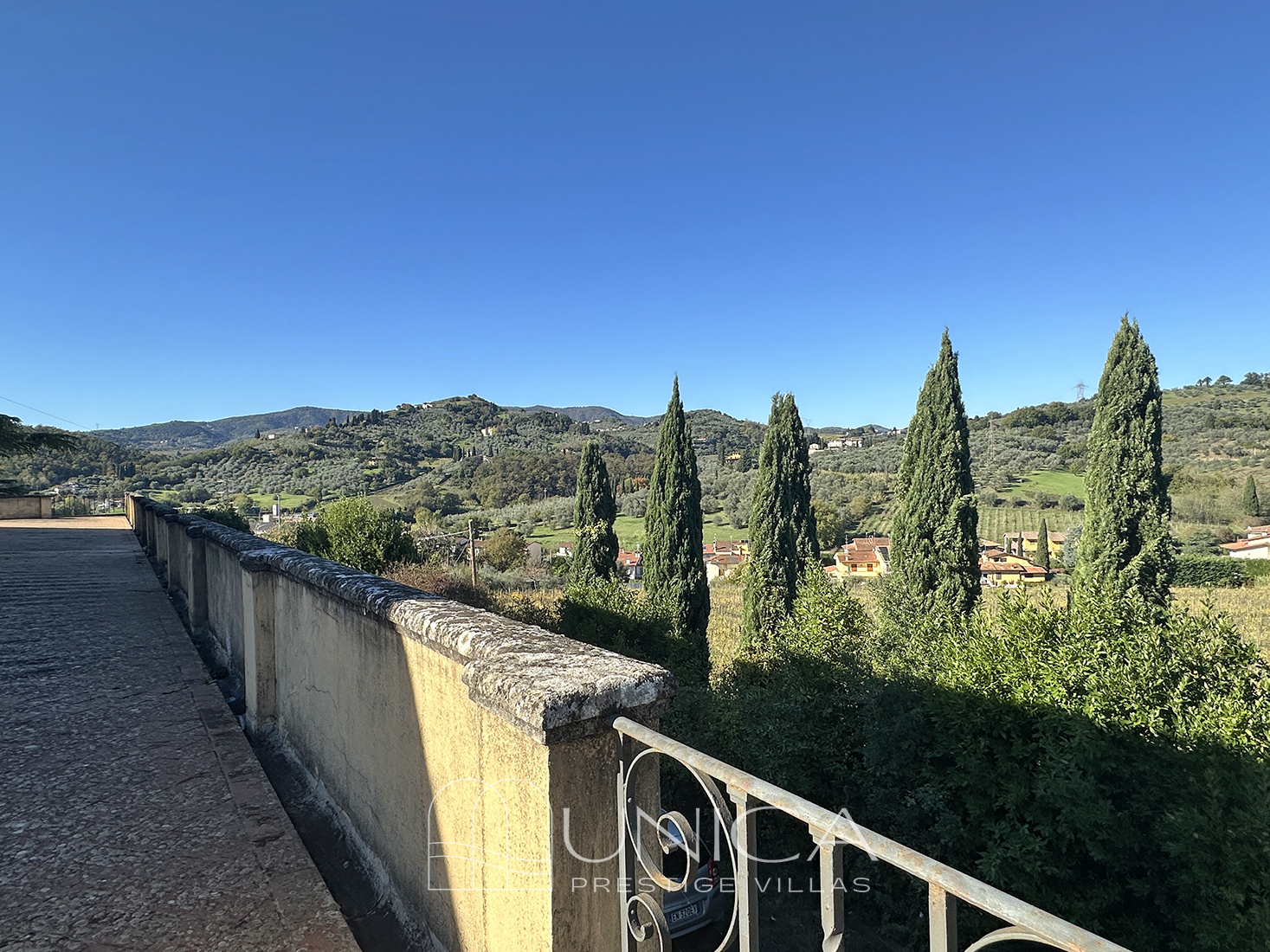 The villa displays the sober and monumental elegance typical of Tuscan Renaissance residences. The main body rests on broad, harmonious foundations, surmounted by the piano nobile which opens onto the extraordinary 600 sqm panoramic terrace — a true belvedere overlooking the Carmignano countryside, the Medici Villa, and, in the distance, Brunelleschi’s dome. The façade is defined by a scenic three-arched loggia, while the lower side wings lend balance and architectural grace.