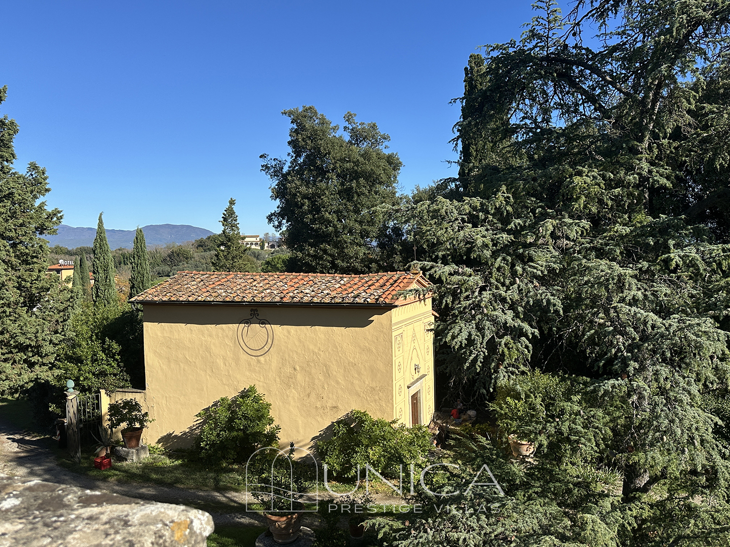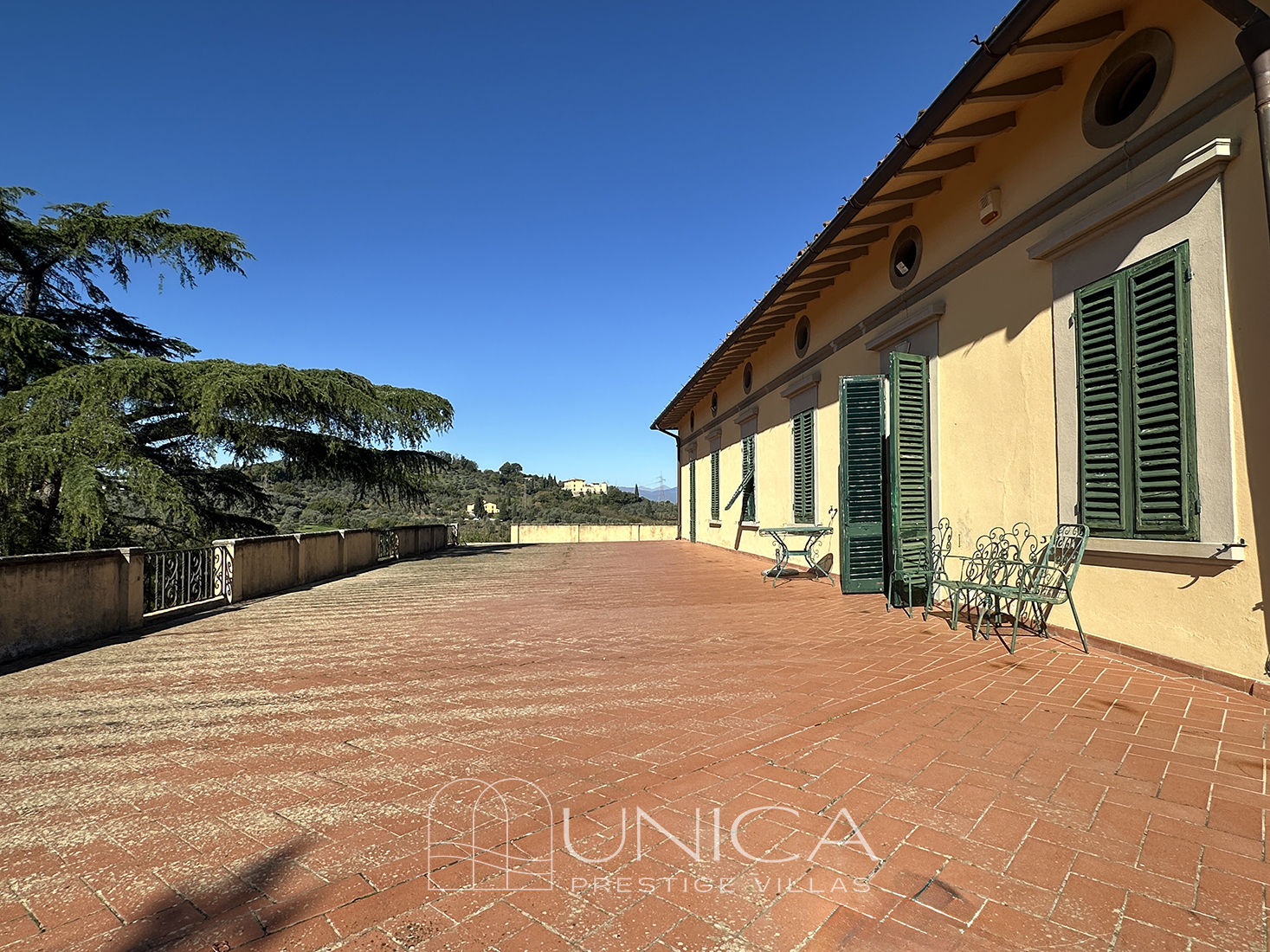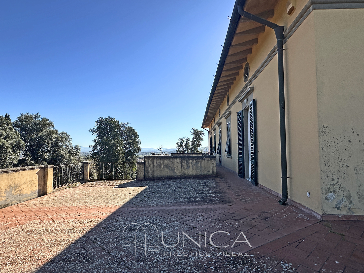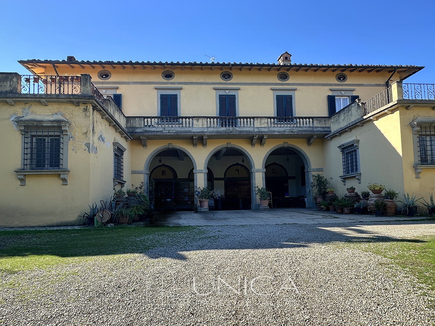 The villa displays the sober and monumental elegance typical of Tuscan Renaissance residences. The main body rests on broad, harmonious foundations, surmounted by the piano nobile which opens onto the extraordinary 600 sqm panoramic terrace — a true belvedere overlooking the Carmignano countryside, the Medici Villa, and, in the distance, Brunelleschi’s dome. The façade is defined by a scenic three-arched loggia, while the lower side wings lend balance and architectural grace.