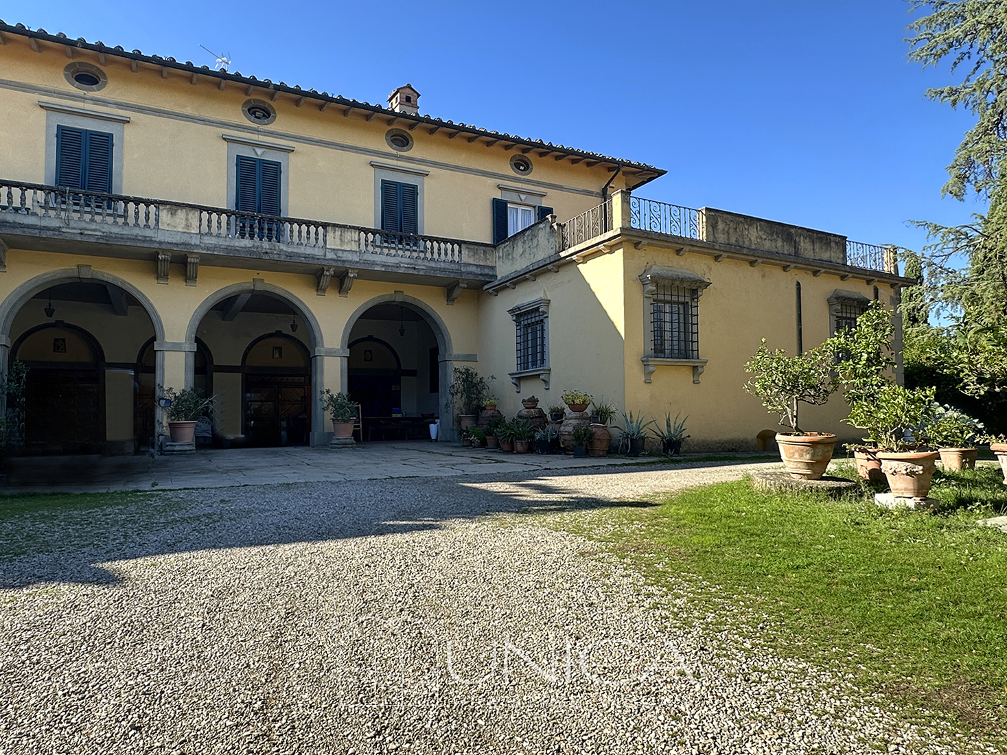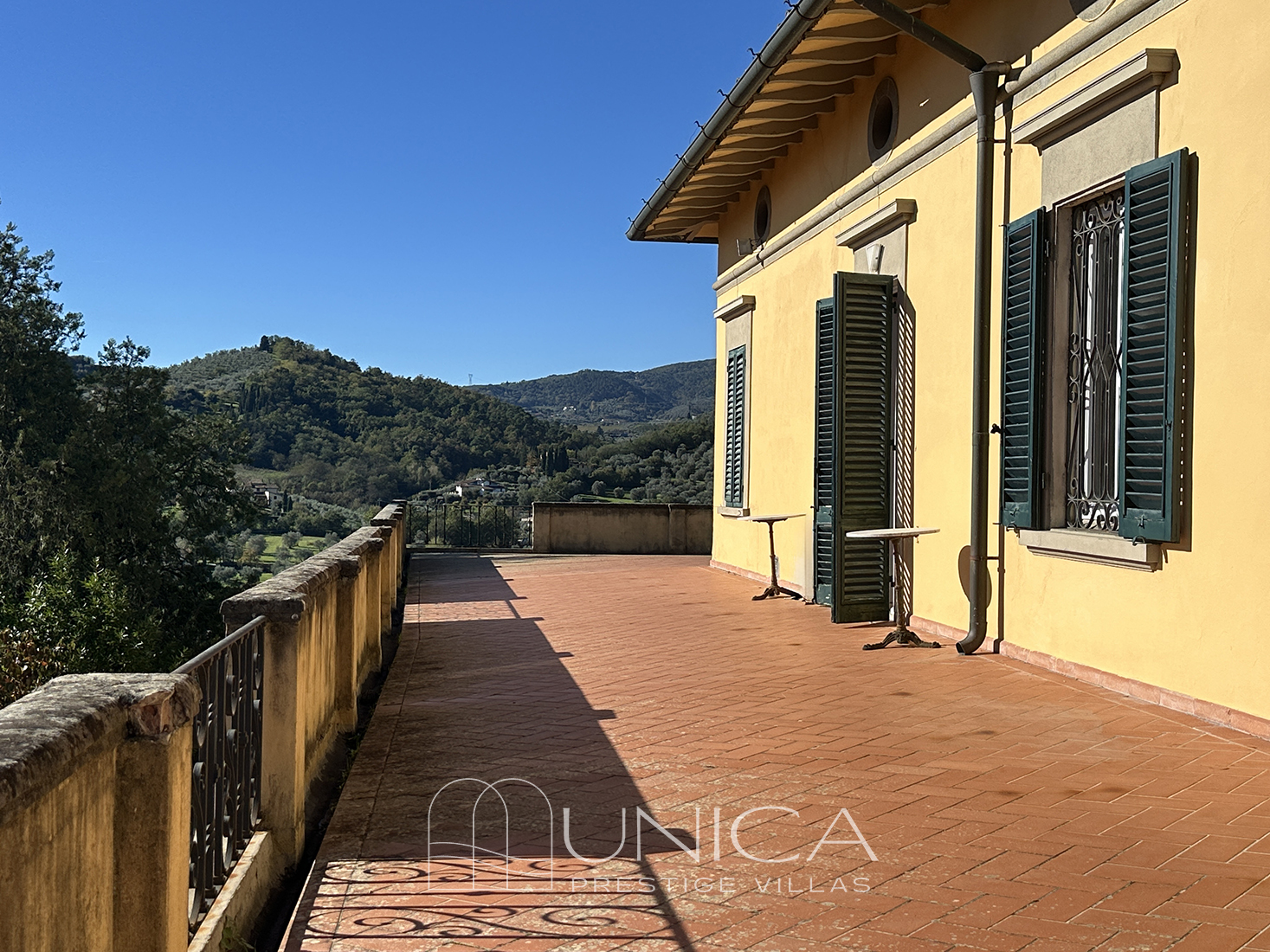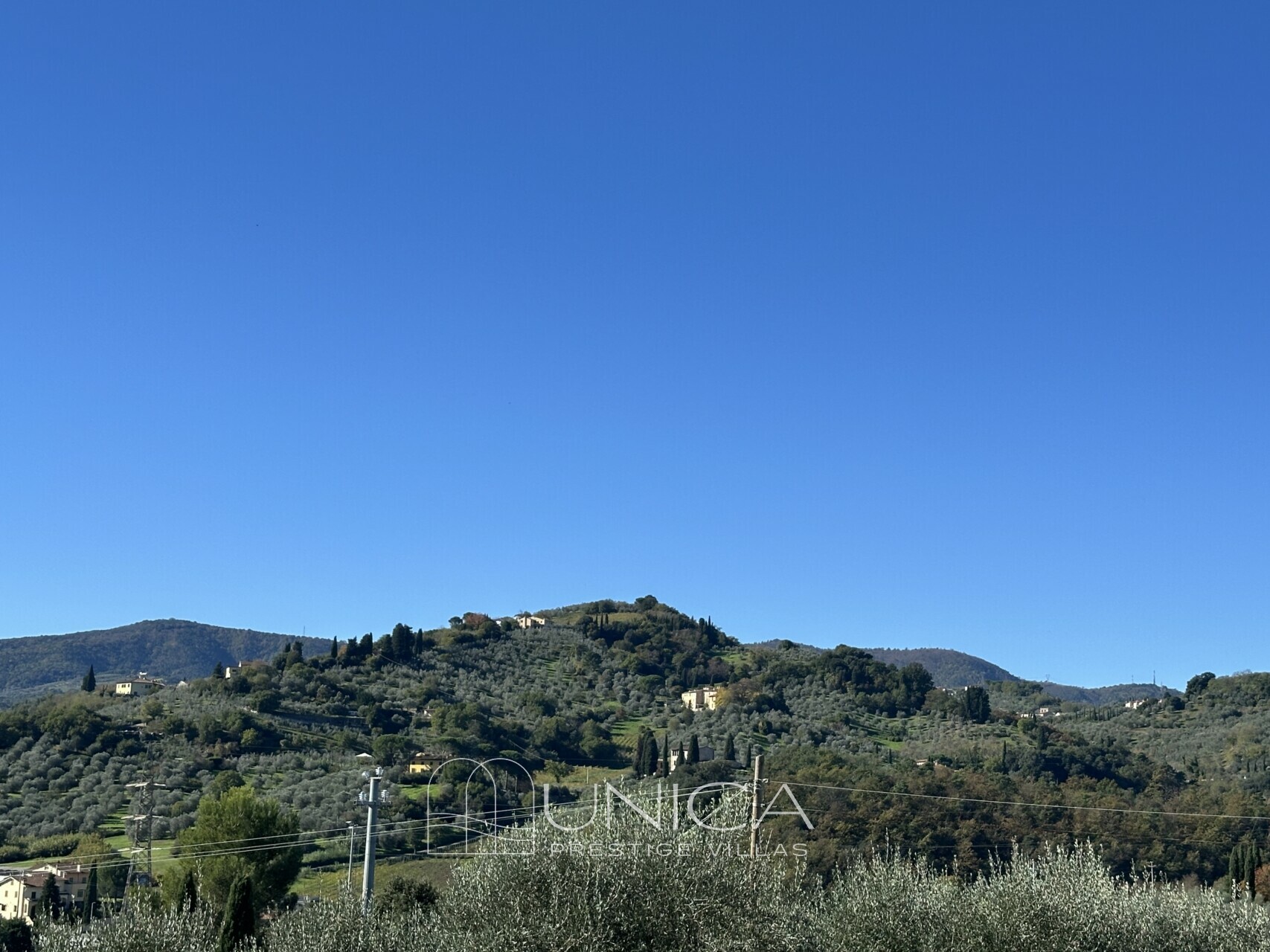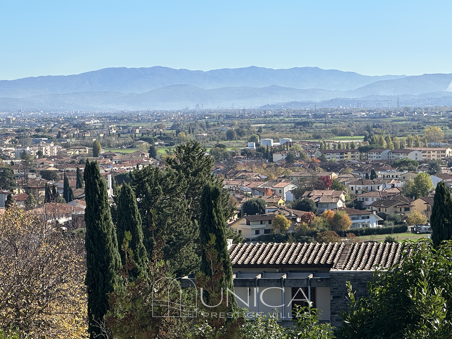 The villa displays the sober and monumental elegance typical of Tuscan Renaissance residences. The main body rests on broad, harmonious foundations, surmounted by the piano nobile which opens onto the extraordinary 600 sqm panoramic terrace — a true belvedere overlooking the Carmignano countryside, the Medici Villa, and, in the distance, Brunelleschi’s dome. The façade is defined by a scenic three-arched loggia, while the lower side wings lend balance and architectural grace.