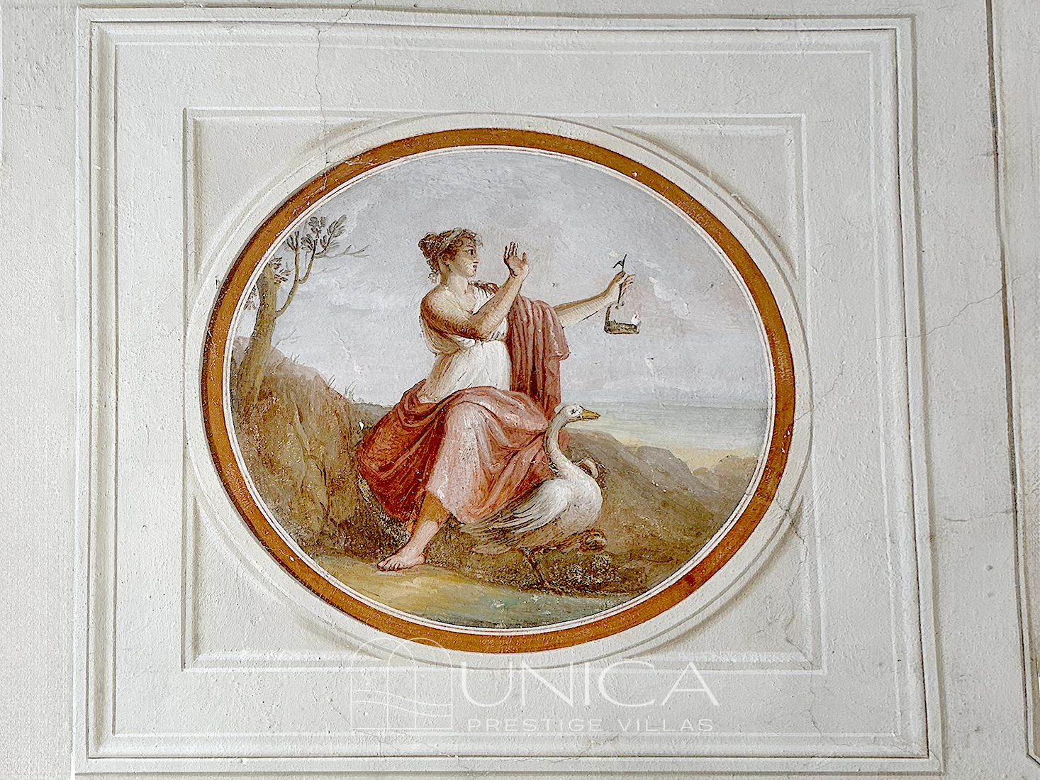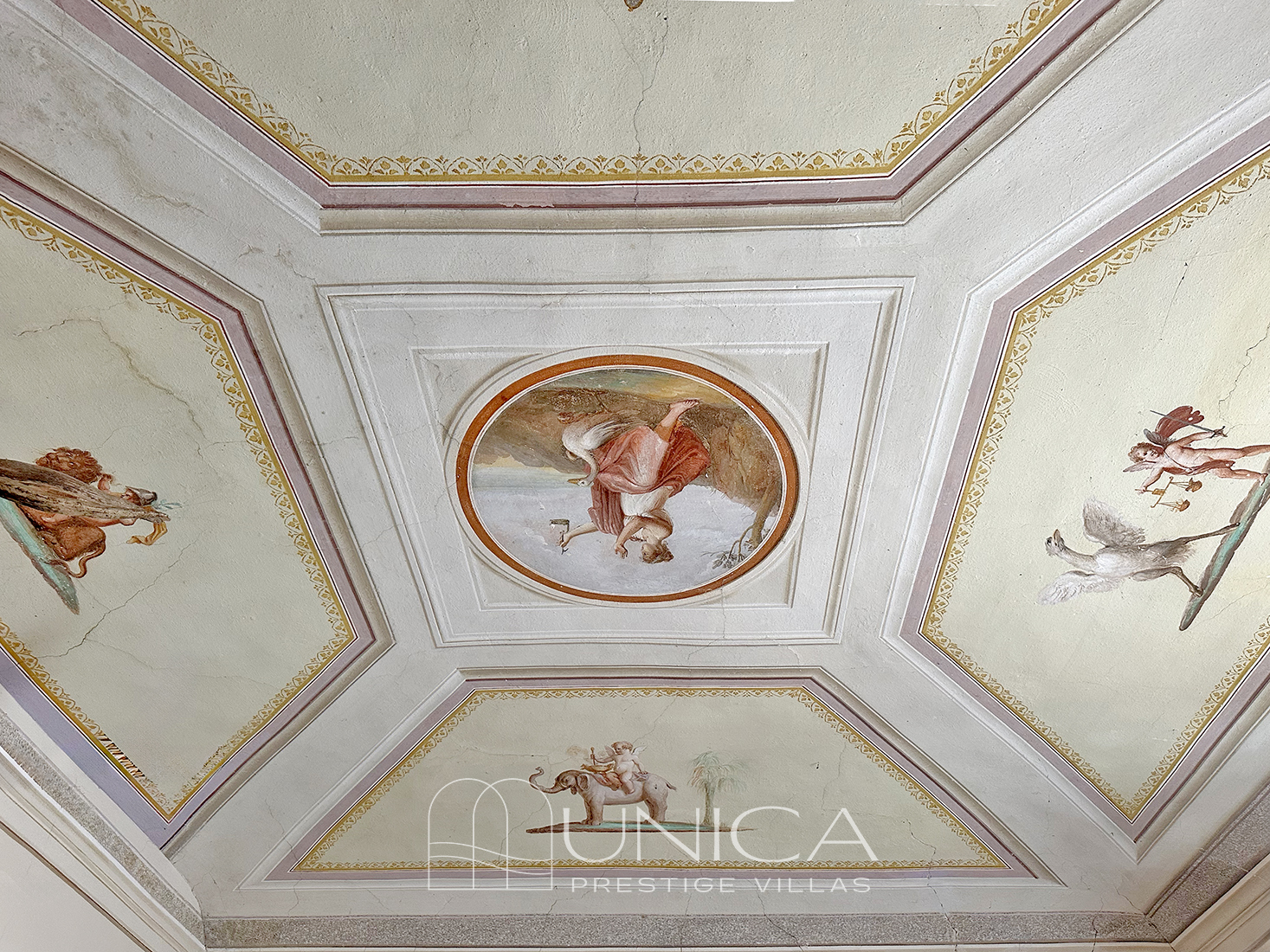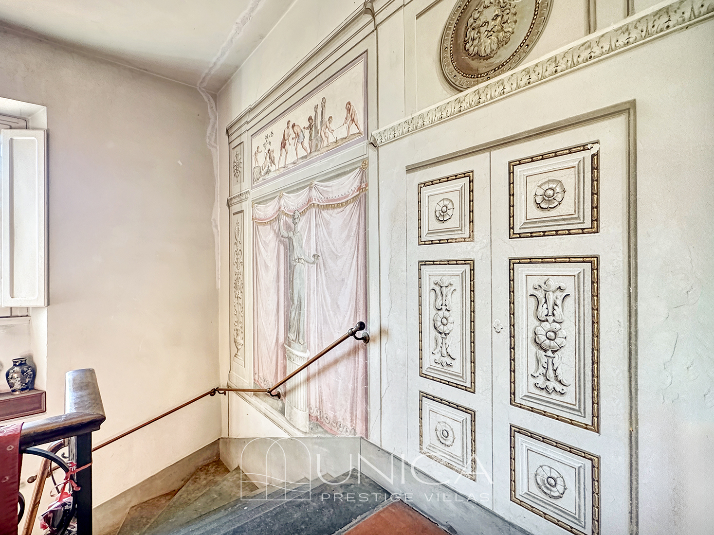 The ten bedrooms and nine bathrooms are designed to offer both comfort and privacy, with light-filled spaces arranged thoughtfully throughout the home. At the piano nobile — the historical heart of the property — magnificent original frescoes, beautifully preserved, adorn the salons and corridors, imbuing the interiors with timeless atmosphere and refined character.