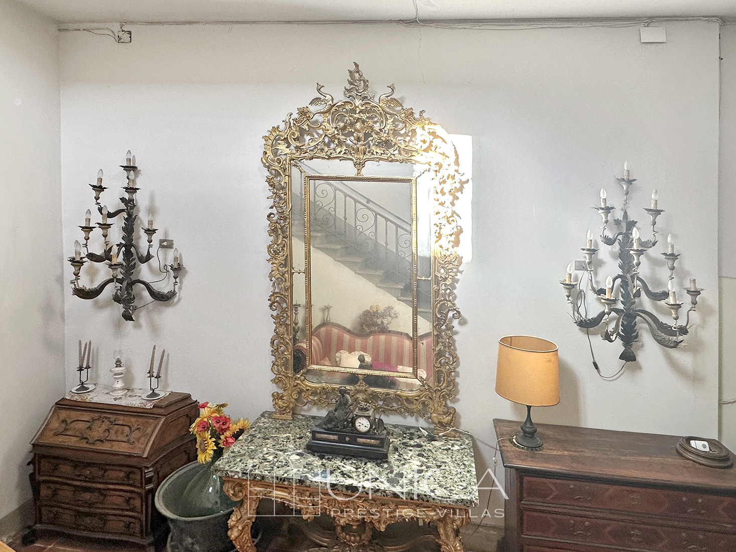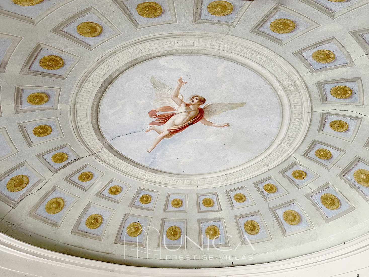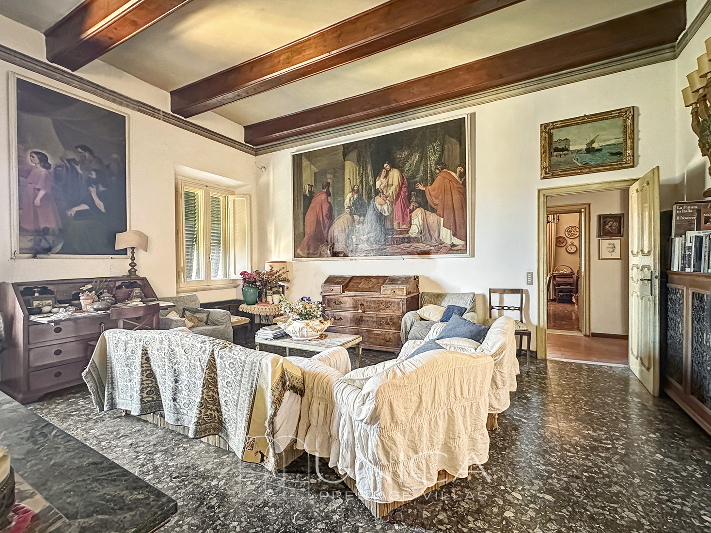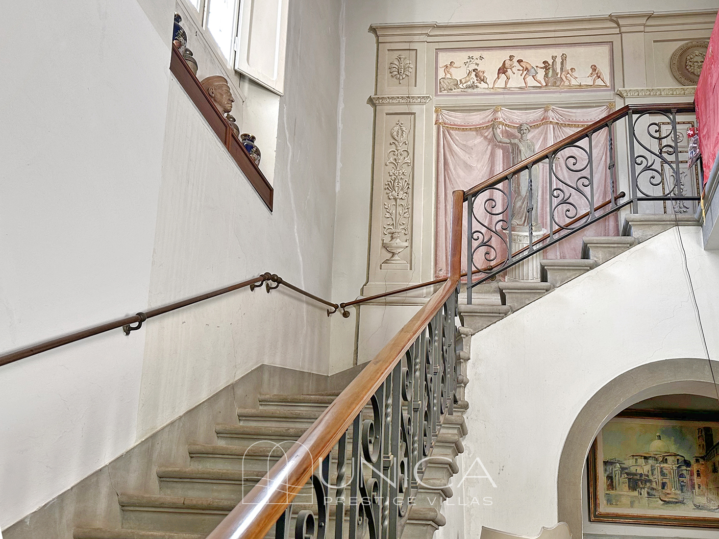 The ten bedrooms and nine bathrooms are designed to offer both comfort and privacy, with light-filled spaces arranged thoughtfully throughout the home. At the piano nobile — the historical heart of the property — magnificent original frescoes, beautifully preserved, adorn the salons and corridors, imbuing the interiors with timeless atmosphere and refined character.