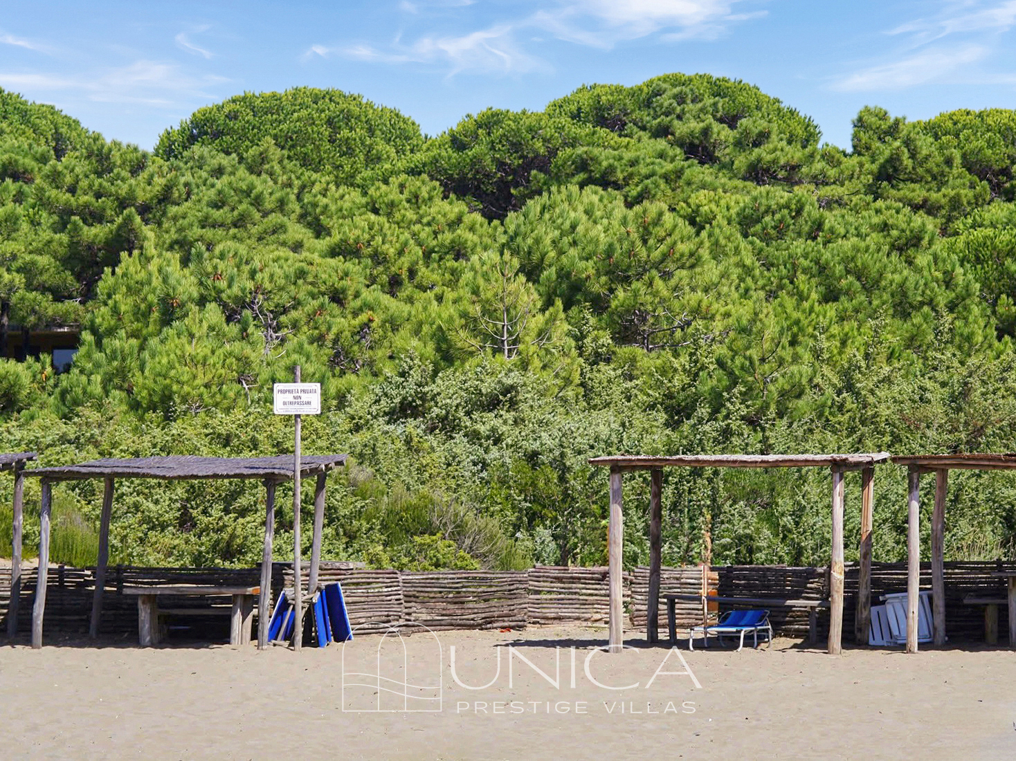 Villa Raimondo, located in the renowned Pineta di Roccamare, perfectly embodies the balance between nature and privacy. Built in the 1950s at the behest of Count Piero Ginori Conti, the complex is situated in the Tuscan Maremma and houses approximately 200 villas, all immersed in a protected natural landscape. Access to the pine forest is exclusive, guaranteed by a 24-hour concierge service that ensures security and tranquility. Each villa is surrounded by private land, with native vegetation of junipers and strawberry trees, ensuring maximum discretion.