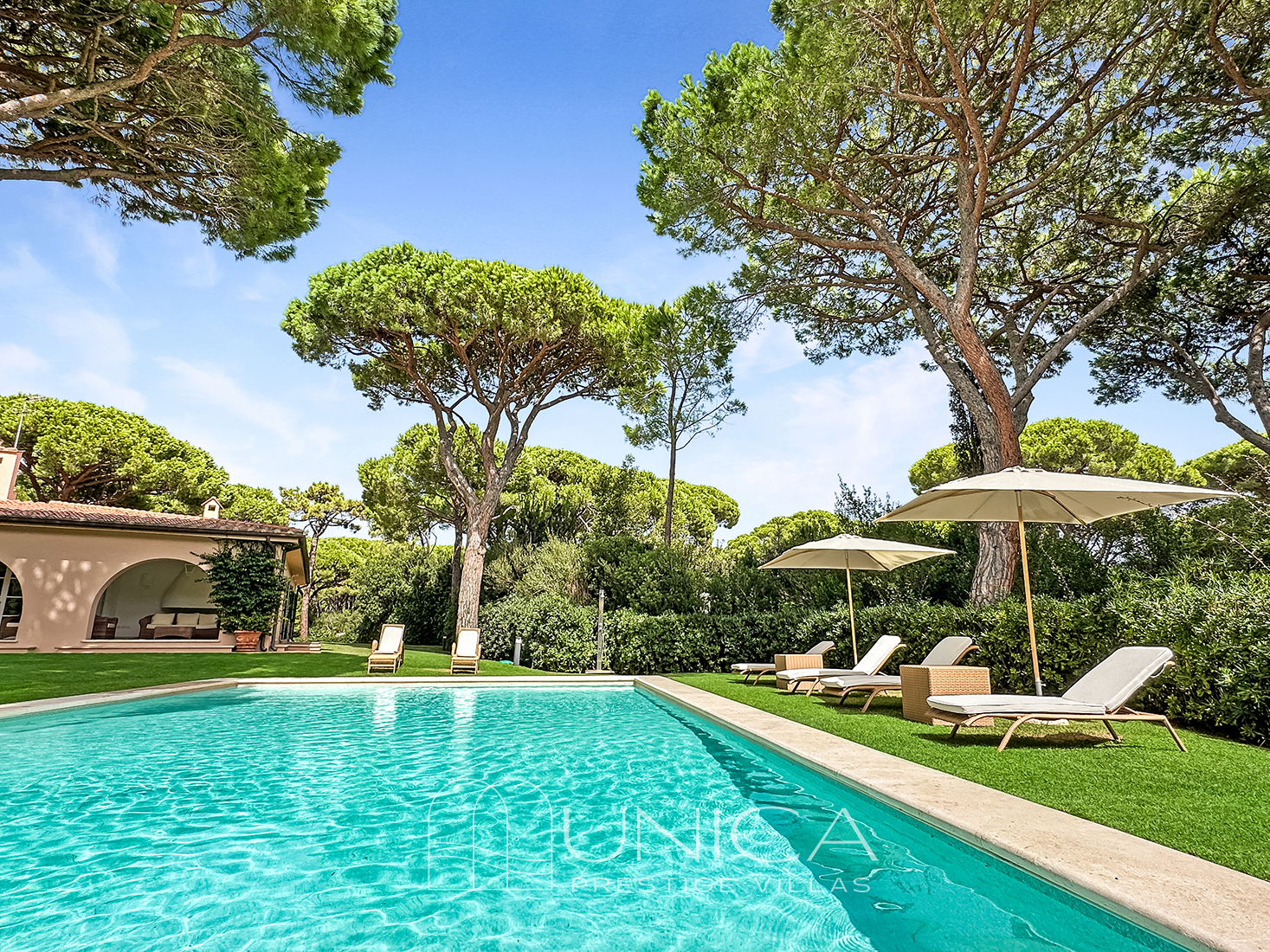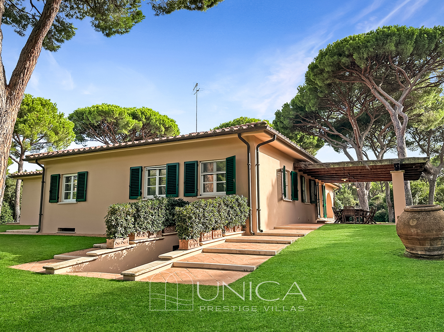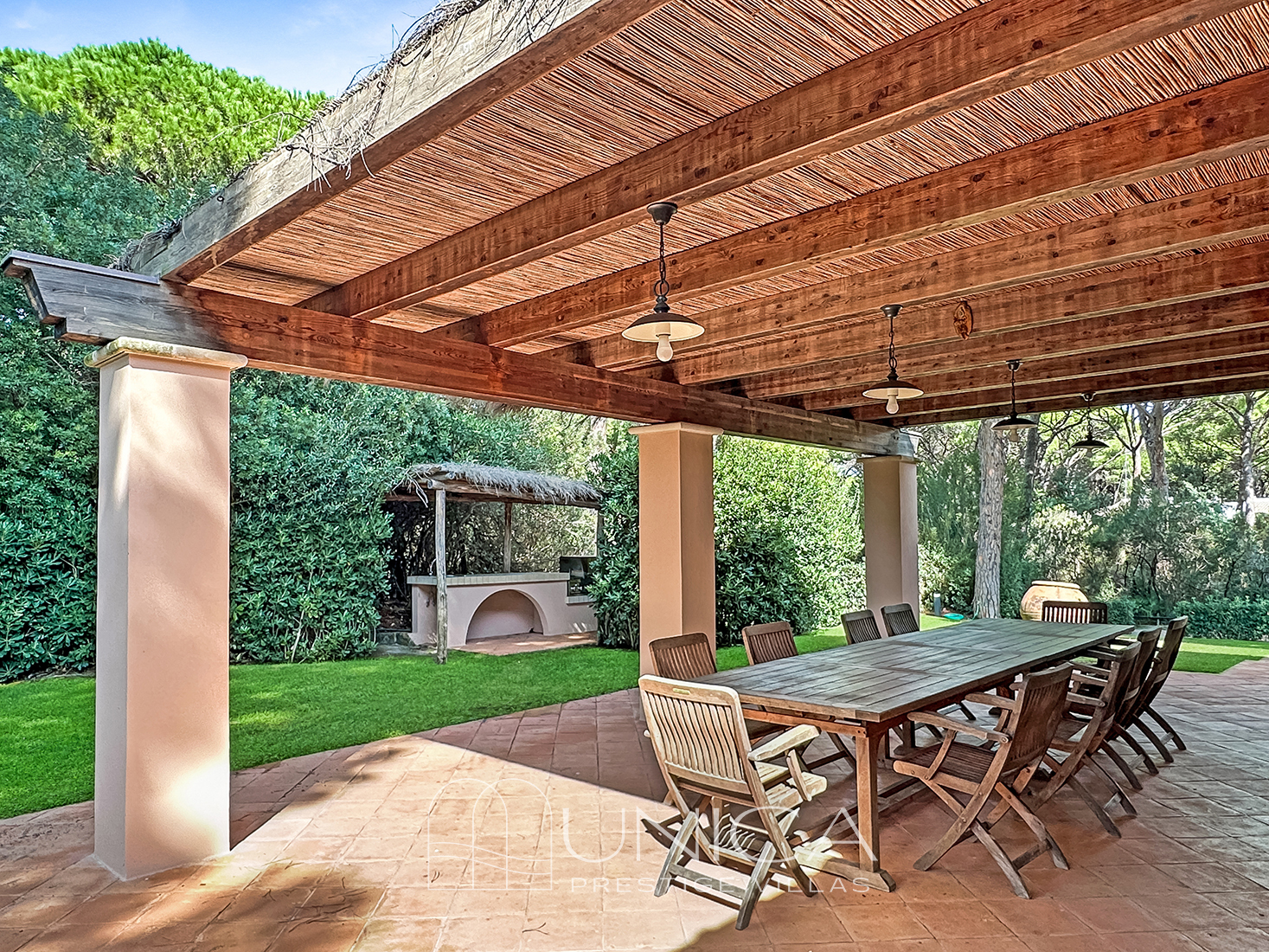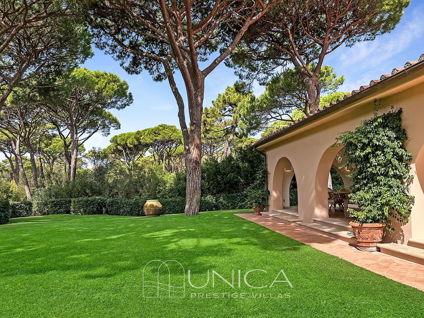 Il giardino che circonda la villa è un’oasi di eleganza, con maestosi pini marittimi che offrono ombra naturale. La piscina rettangolare, incorniciata da pavimentazione in pietra naturale e circondata da lettini e ombrelloni, è il luogo ideale per il relax. Il porticato ad archi, collegato al soggiorno tramite ampie vetrate, è arredato con divani e poltrone eleganti, creando uno spazio perfetto per momenti di convivialità.