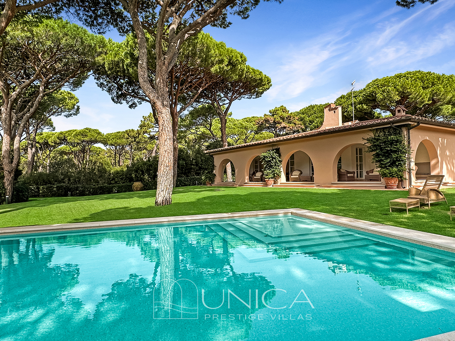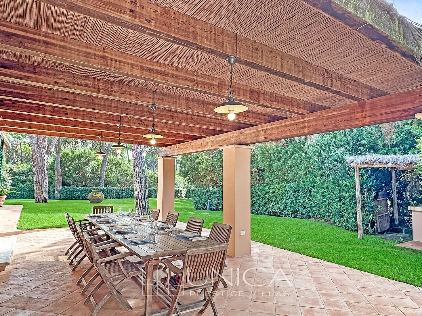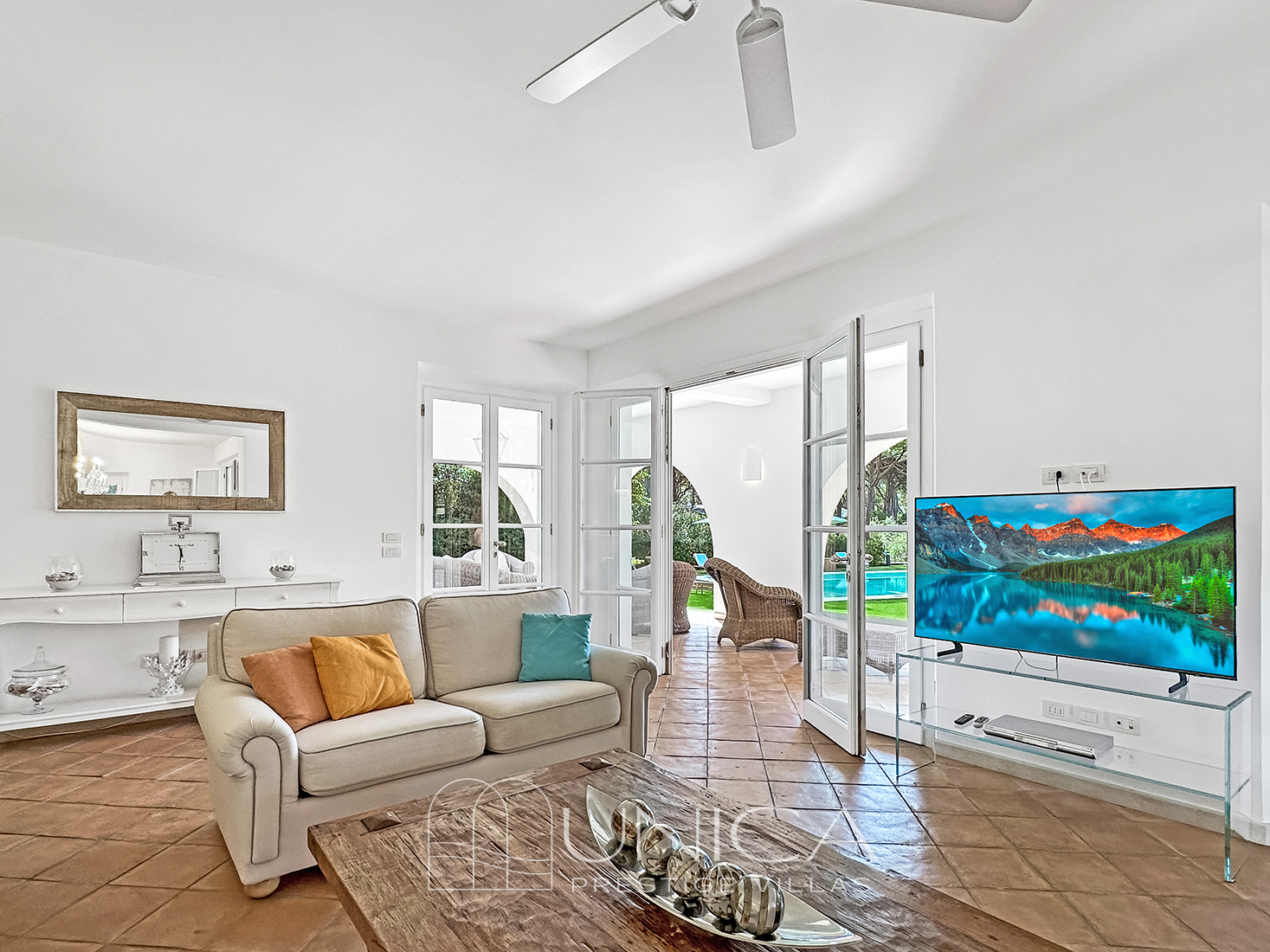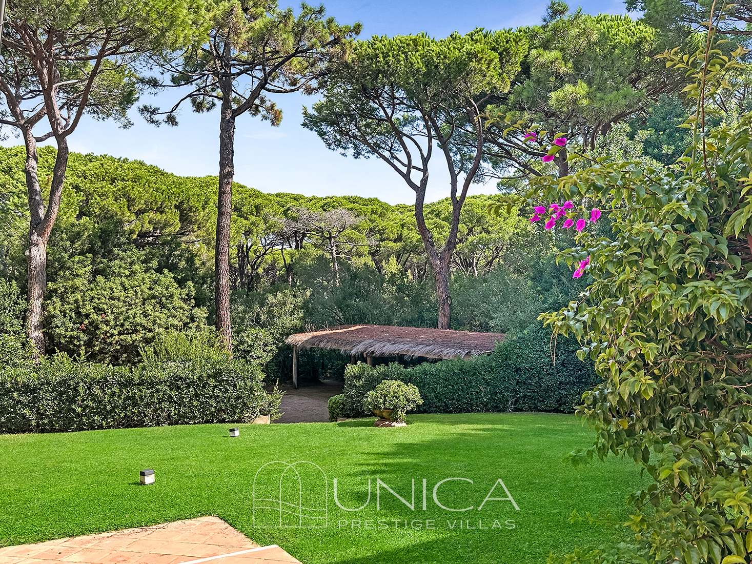 Il giardino che circonda la villa è un’oasi di eleganza, con maestosi pini marittimi che offrono ombra naturale. La piscina rettangolare, incorniciata da pavimentazione in pietra naturale e circondata da lettini e ombrelloni, è il luogo ideale per il relax. Il porticato ad archi, collegato al soggiorno tramite ampie vetrate, è arredato con divani e poltrone eleganti, creando uno spazio perfetto per momenti di convivialità.