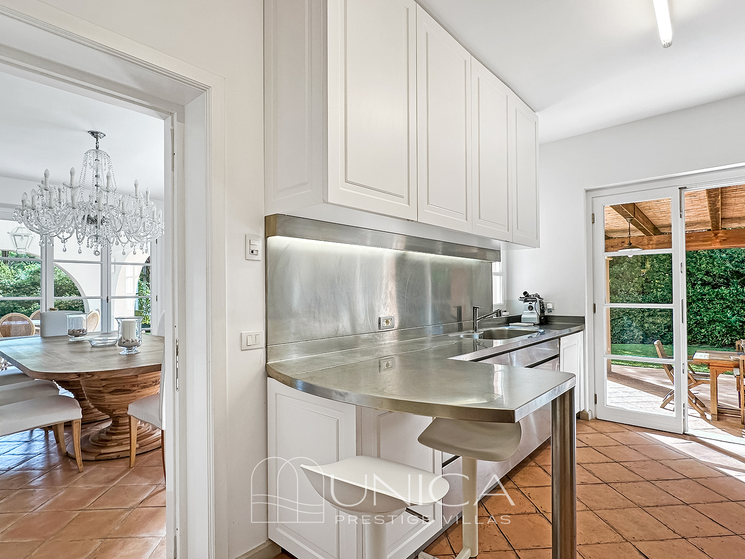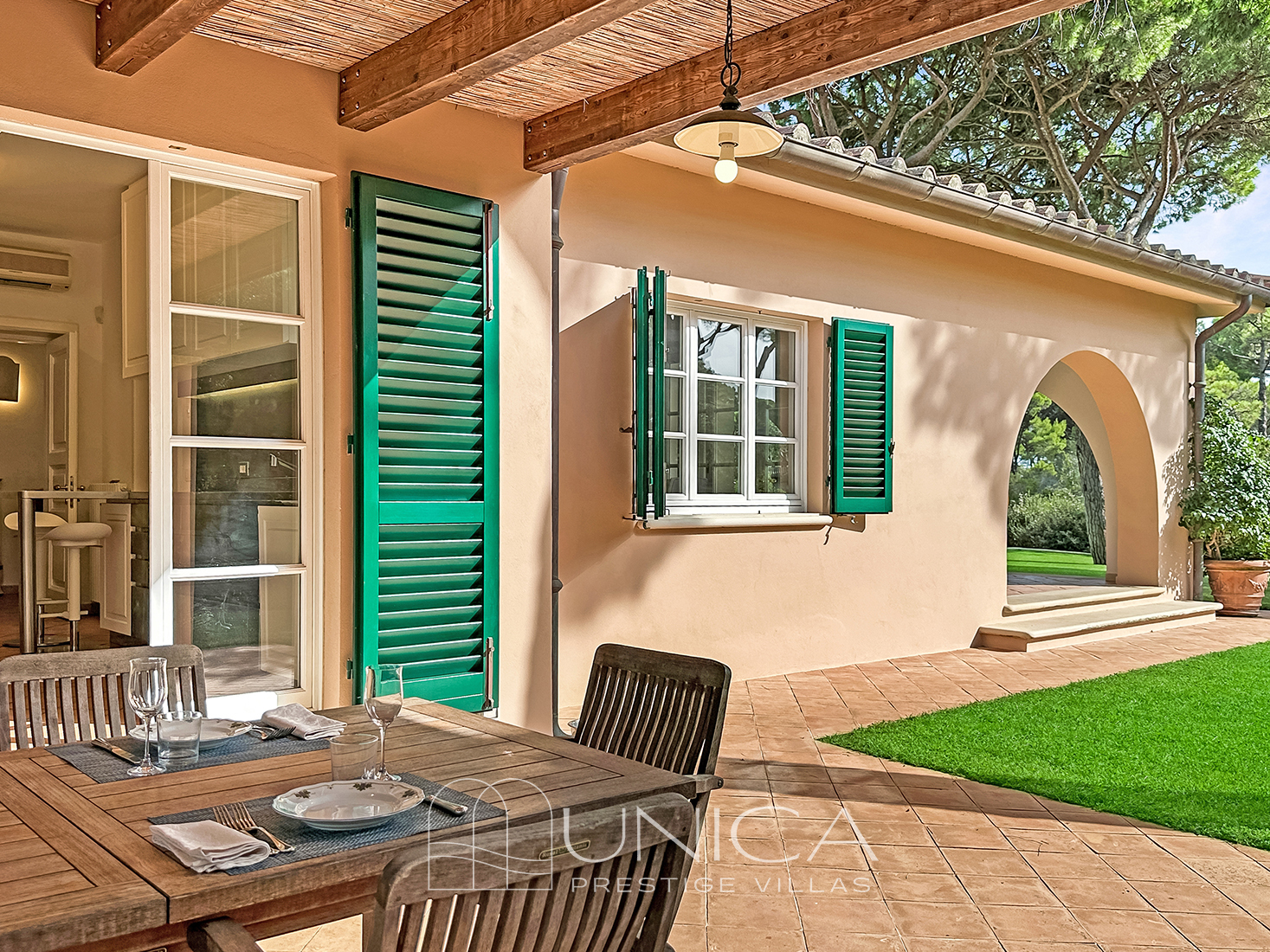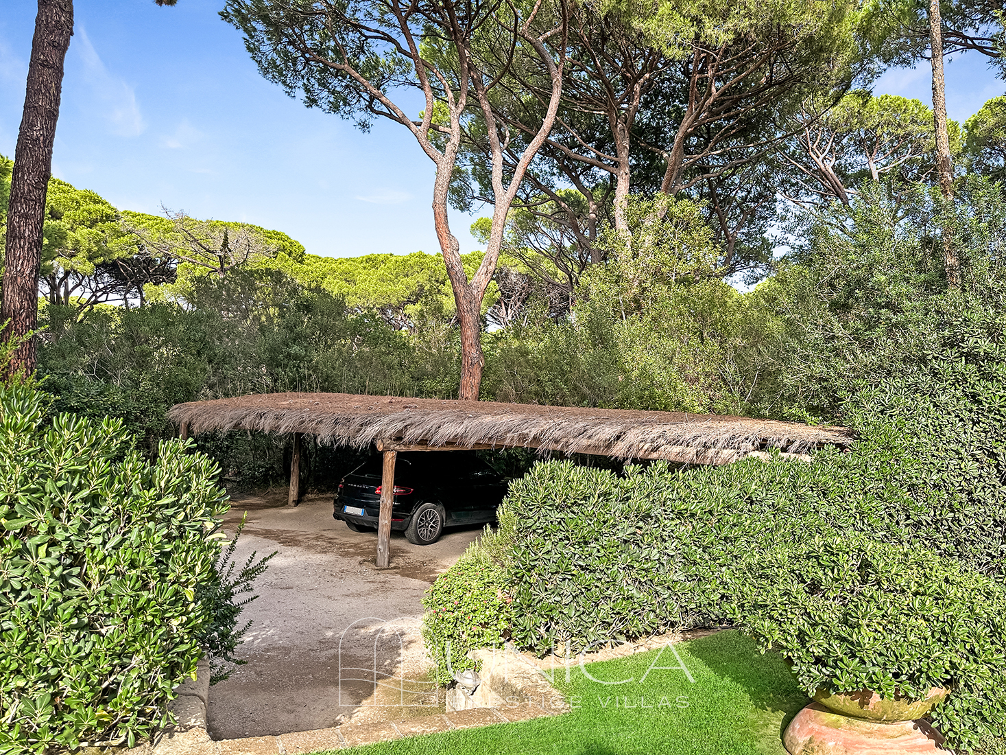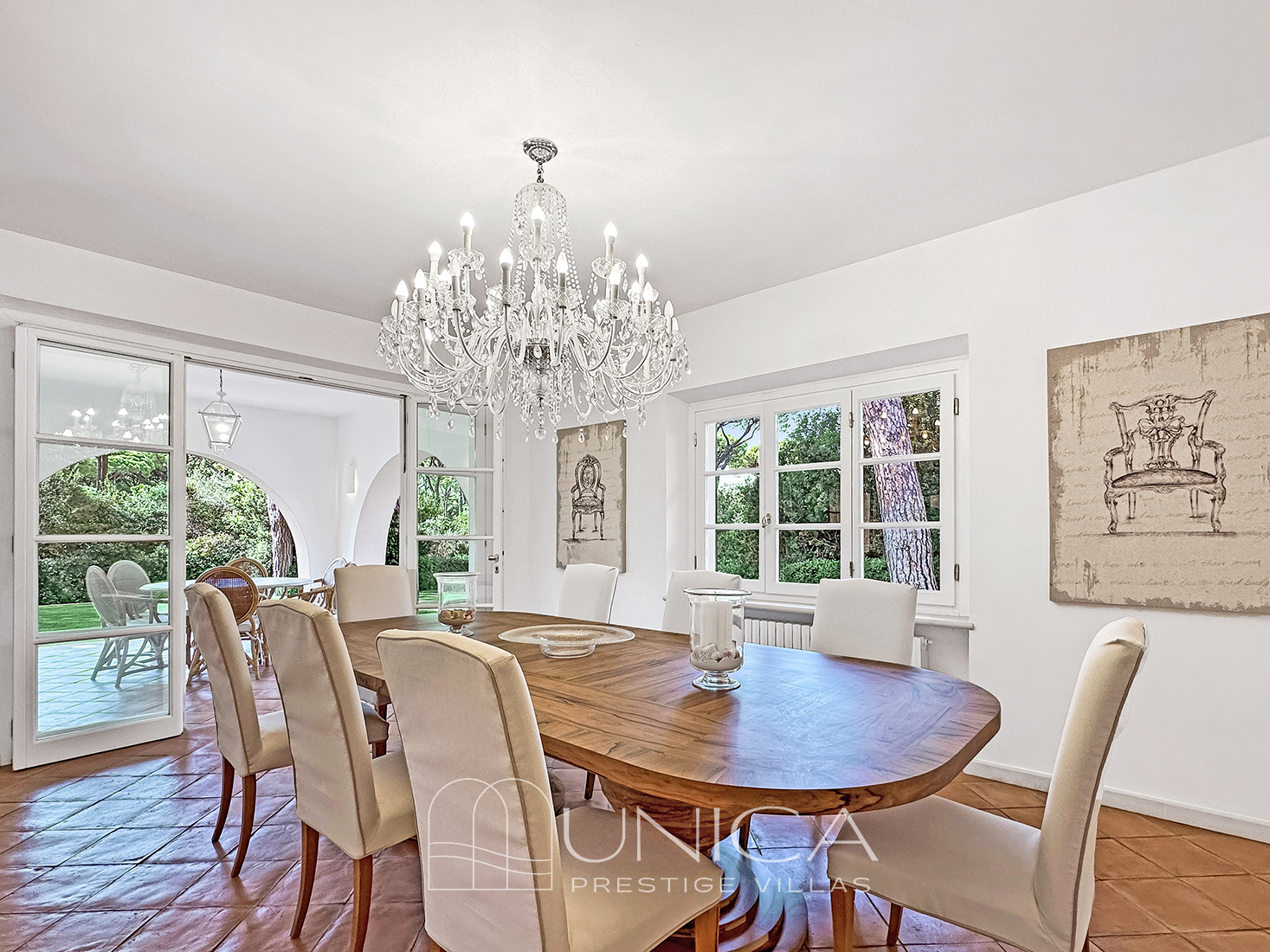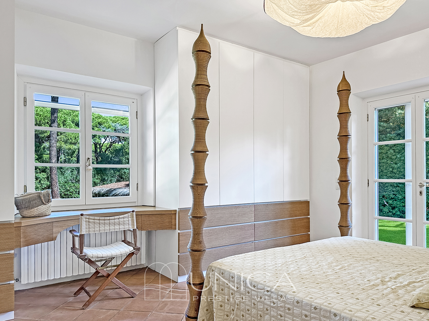 Il giardino che circonda la villa è un’oasi di eleganza, con maestosi pini marittimi che offrono ombra naturale. La piscina rettangolare, incorniciata da pavimentazione in pietra naturale e circondata da lettini e ombrelloni, è il luogo ideale per il relax. Il porticato ad archi, collegato al soggiorno tramite ampie vetrate, è arredato con divani e poltrone eleganti, creando uno spazio perfetto per momenti di convivialità.