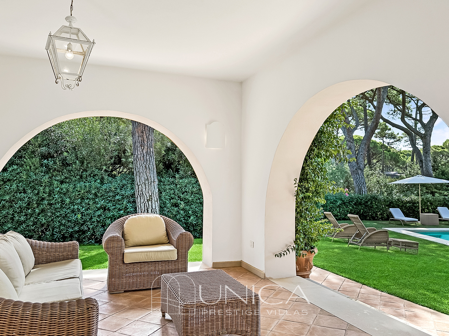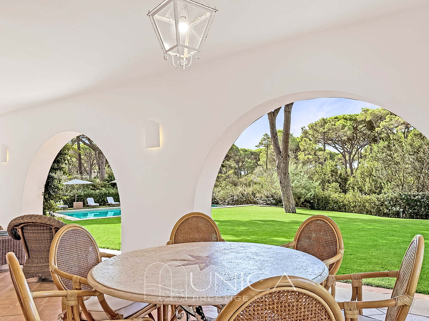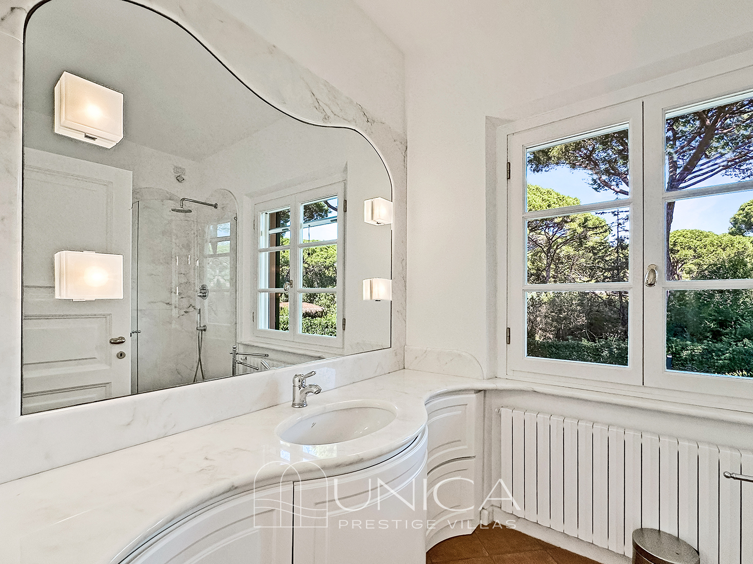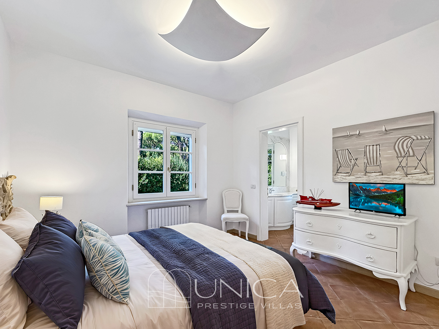 Il giardino che circonda la villa è un’oasi di eleganza, con maestosi pini marittimi che offrono ombra naturale. La piscina rettangolare, incorniciata da pavimentazione in pietra naturale e circondata da lettini e ombrelloni, è il luogo ideale per il relax. Il porticato ad archi, collegato al soggiorno tramite ampie vetrate, è arredato con divani e poltrone eleganti, creando uno spazio perfetto per momenti di convivialità.