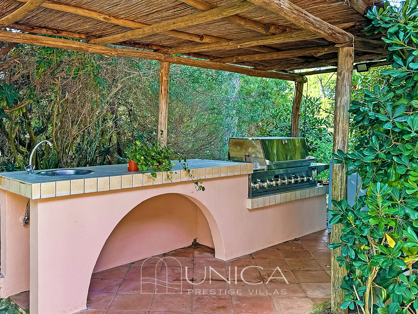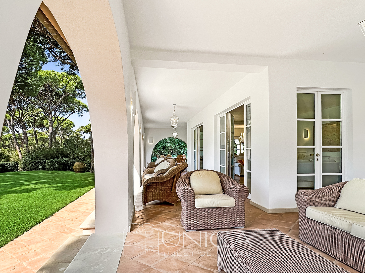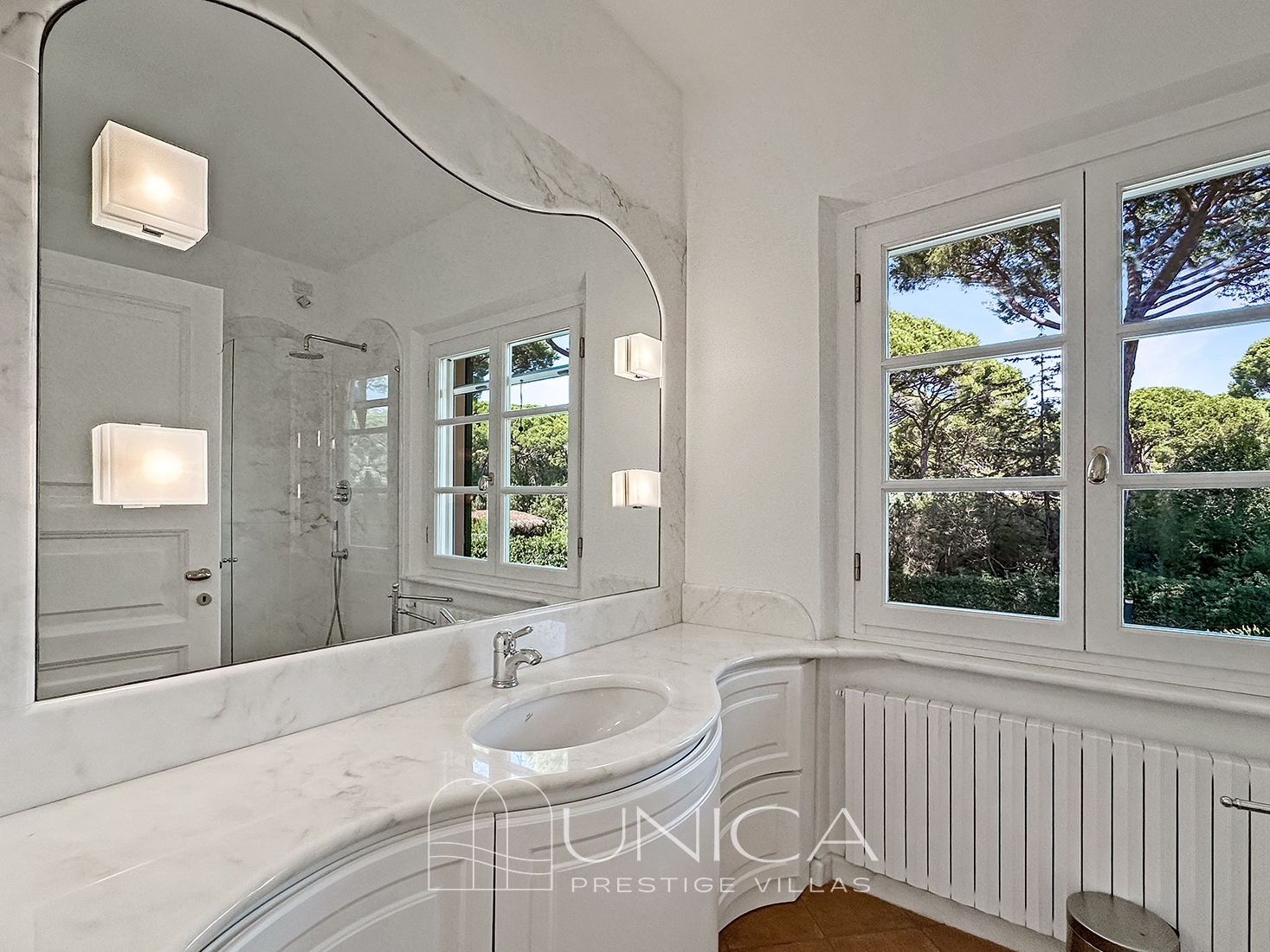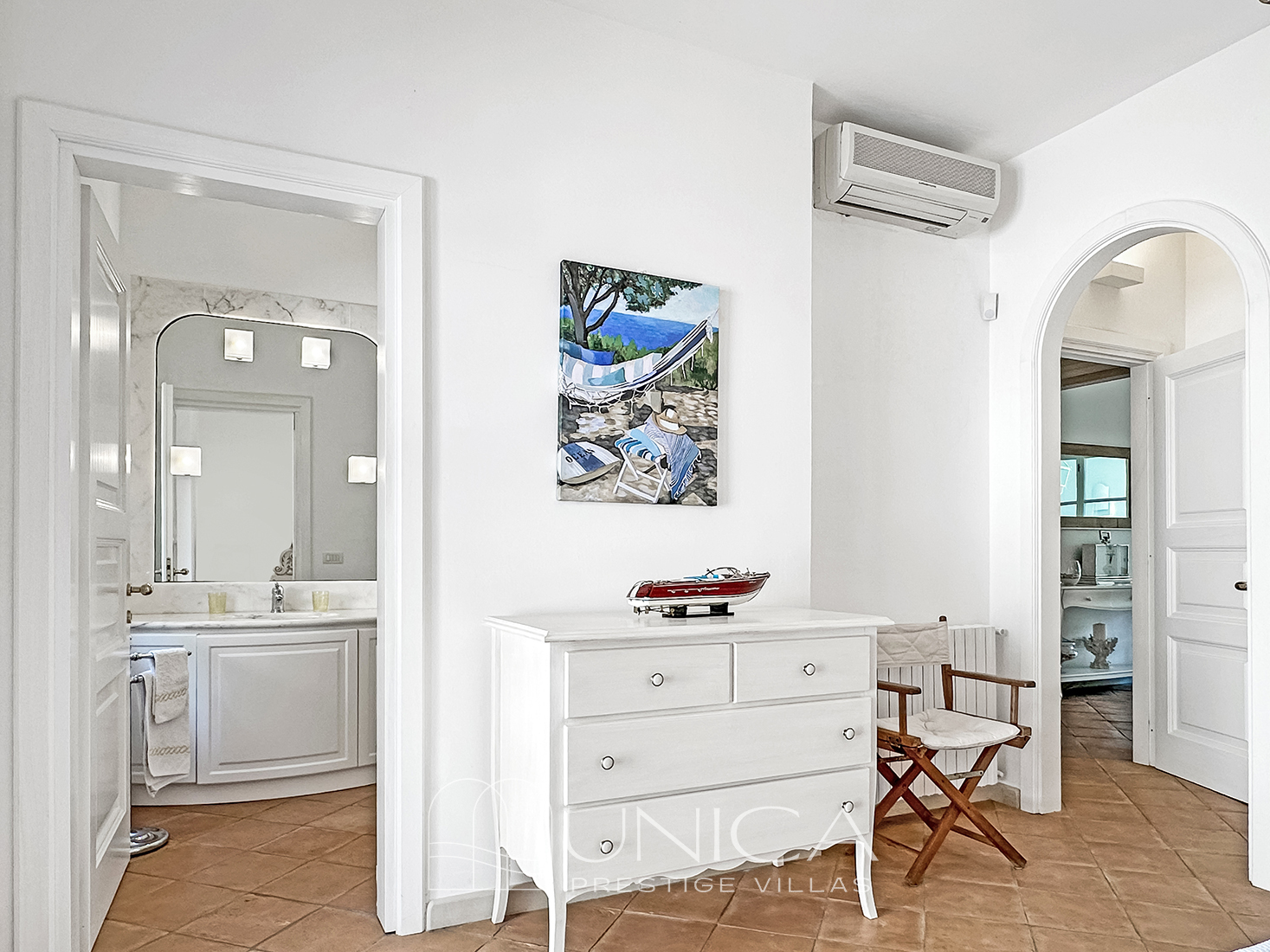 Il giardino che circonda la villa è un’oasi di eleganza, con maestosi pini marittimi che offrono ombra naturale. La piscina rettangolare, incorniciata da pavimentazione in pietra naturale e circondata da lettini e ombrelloni, è il luogo ideale per il relax. Il porticato ad archi, collegato al soggiorno tramite ampie vetrate, è arredato con divani e poltrone eleganti, creando uno spazio perfetto per momenti di convivialità.