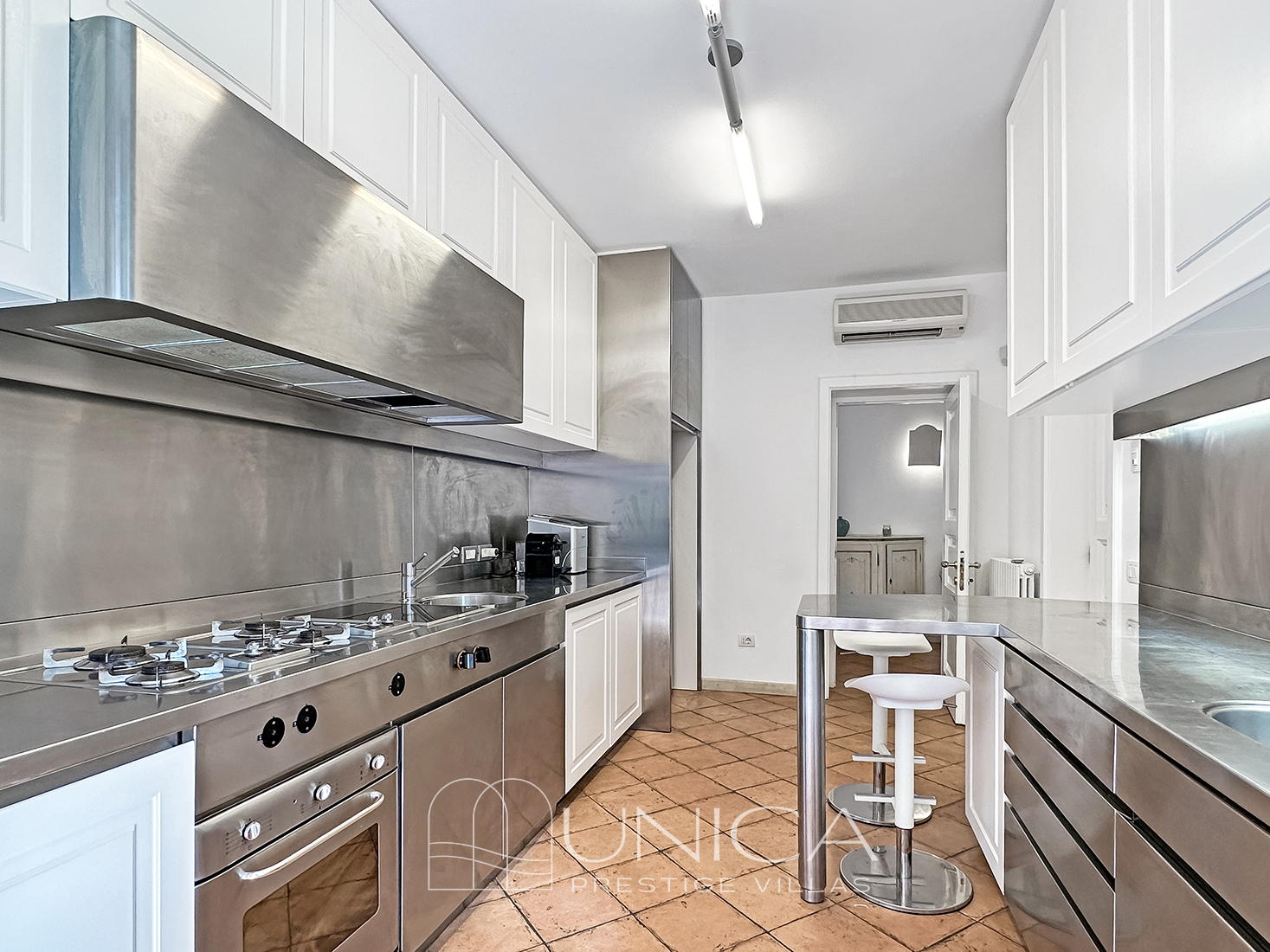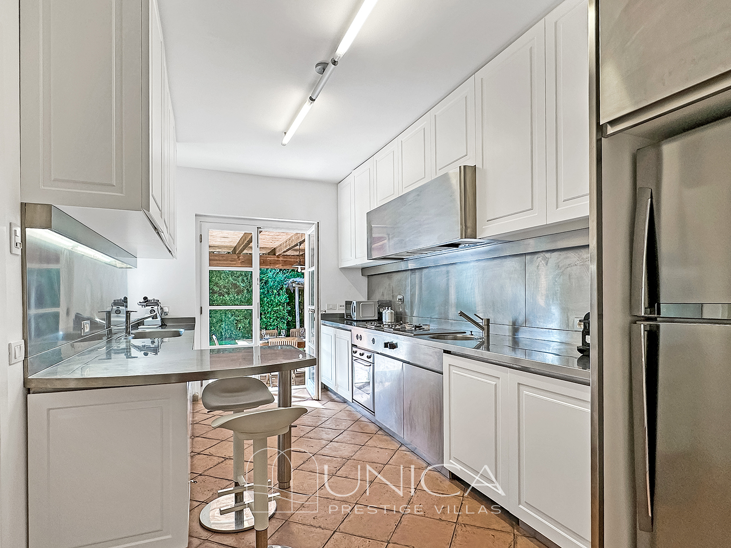 Gli spazi interni della villa coniugano raffinatezza e comfort, offrendo un’atmosfera accogliente e luminosa. Il soggiorno, elegante e spazioso, è arricchito da soffici divani, complementi di design e dettagli artistici che ne esaltano il carattere. La zona pranzo, con un tavolo da 12 posti e un lampadario in cristallo, è ideale per cene indimenticabili. La cucina, moderna e completamente attrezzata, si apre su un’area esterna, perfetta per pranzi all’aperto.