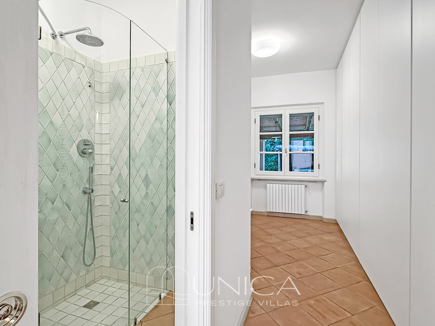 Al piano terra, un comodo bagno di cortesia per gli ospiti aggiunge praticità agli spazi condivisi. La zona notte, composta da cinque camere matrimoniali e una singola, ciascuna con bagno en-suite, è progettata per offrire il massimo del comfort. Alcune camere dispongono di porte finestre che si aprono sul giardino, creando un legame diretto con la natura. Al piano seminterrato, un’area dedicata al personale di servizio, con lavanderia, stireria e bagno, garantisce praticità e discrezione.